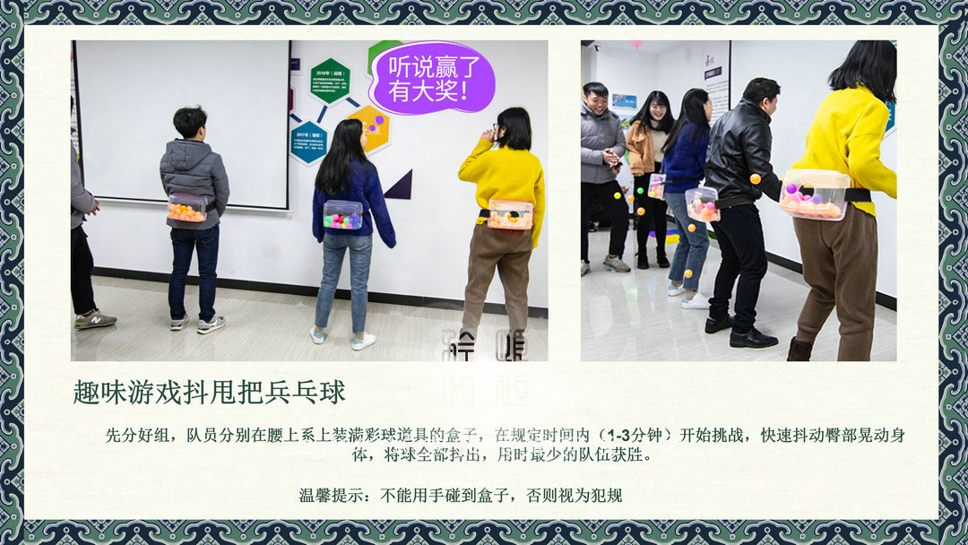 先分好組,隊員分別在腰上系上裝滿彩球道具的盒子,在規定時間內(1-3分鐘)開始挑戰,快速抖動臀部晃動身體,將球全部抖出,用時最少的隊伍獲勝。