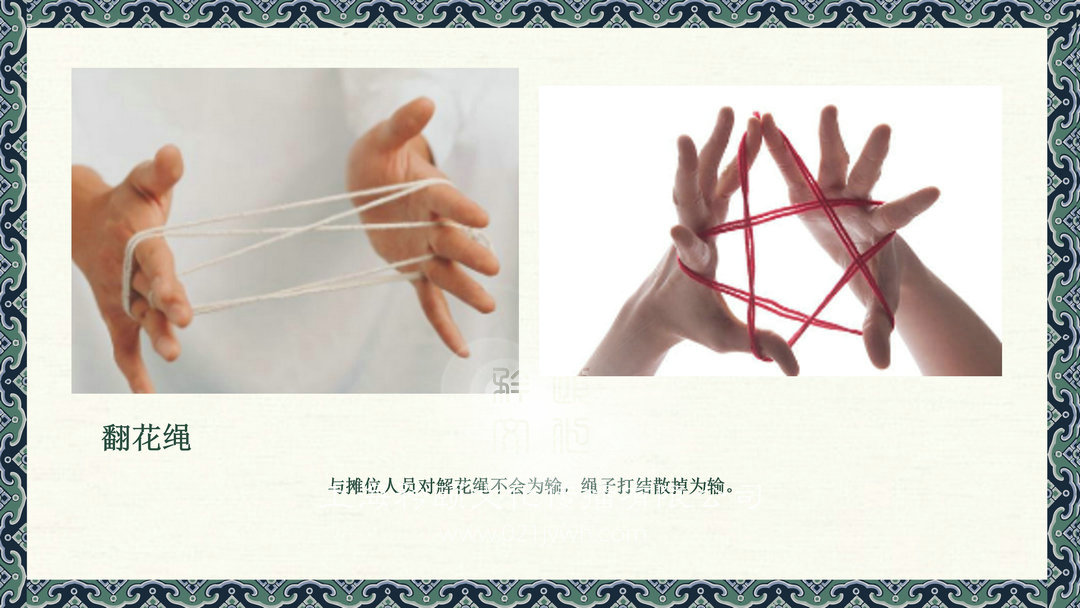 翻花繩,與攤位人員對解花繩不會為輸,繩子打結散掉為輸。