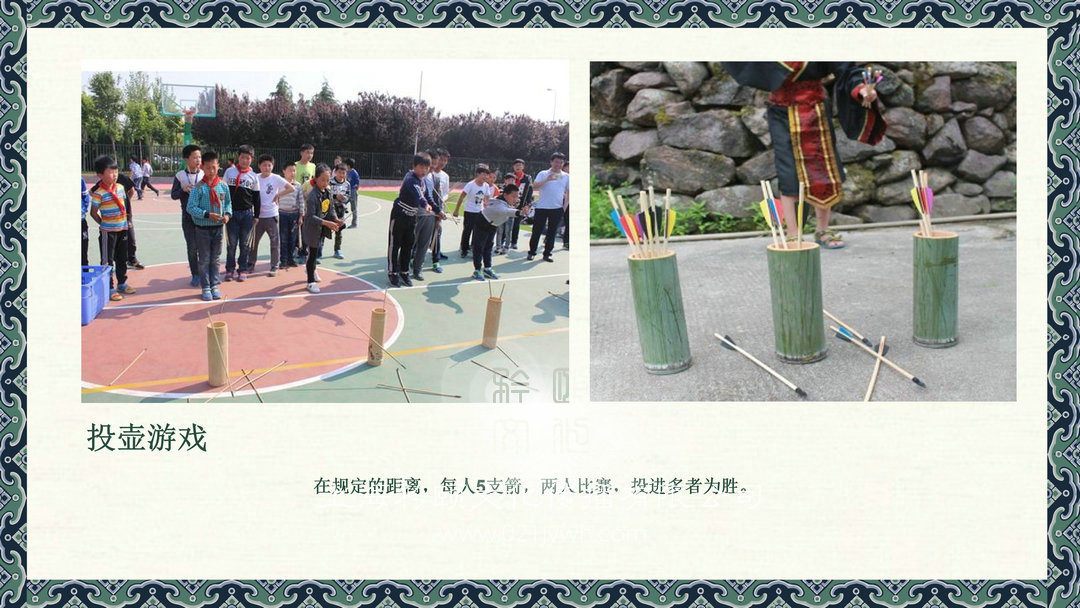 投壺游戲,在規定的距離,每人5支箭,兩人比賽,投進多者為勝。