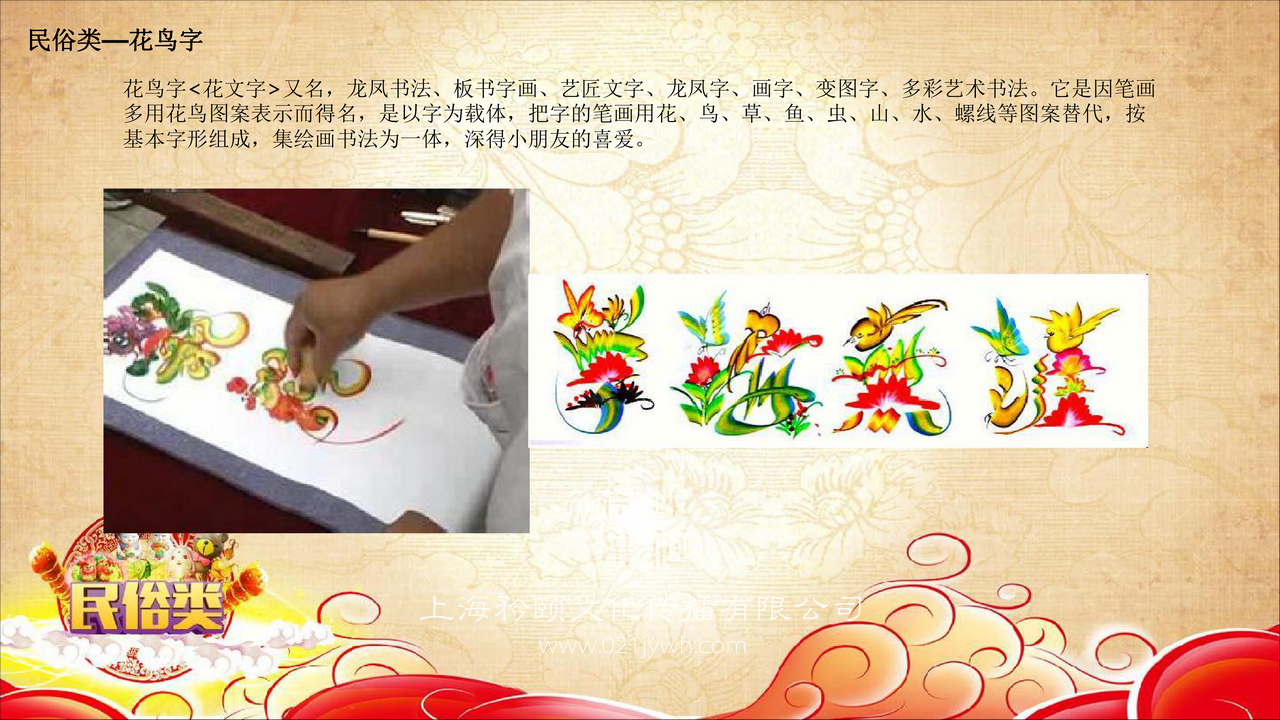 多用花鳥圖案表示而得名,是以字為載體,把字的筆畫用花、鳥、草、魚、蟲、山、水、螺線等圖案替代,按