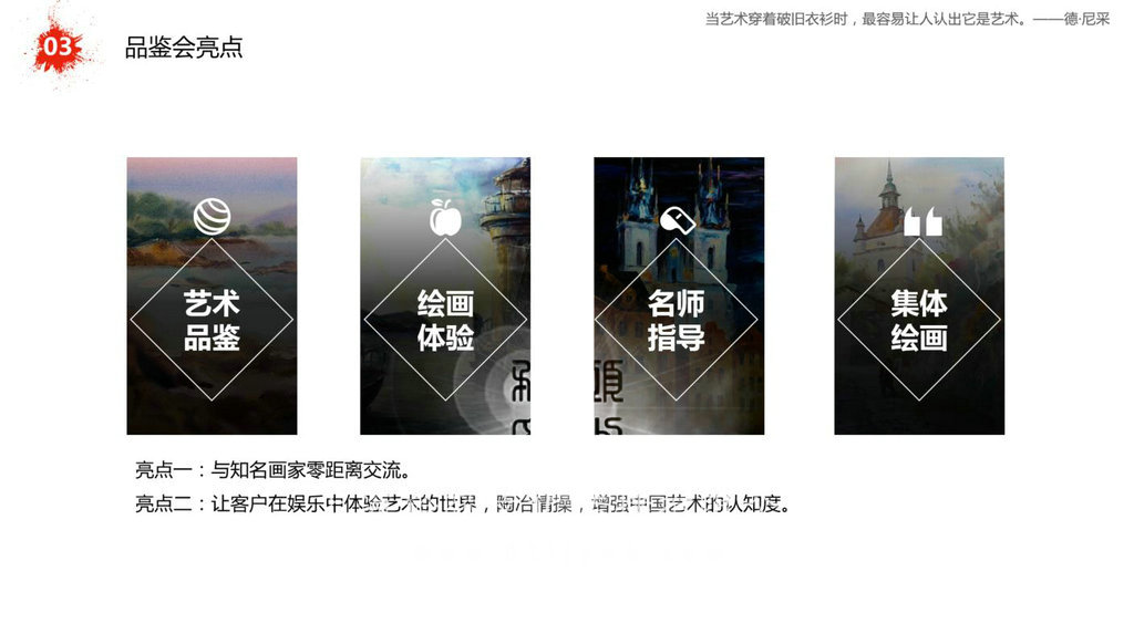 亮點二:讓客戶在娛樂中體驗藝術的世界,陶冶情操,增強中國藝術的認知度。