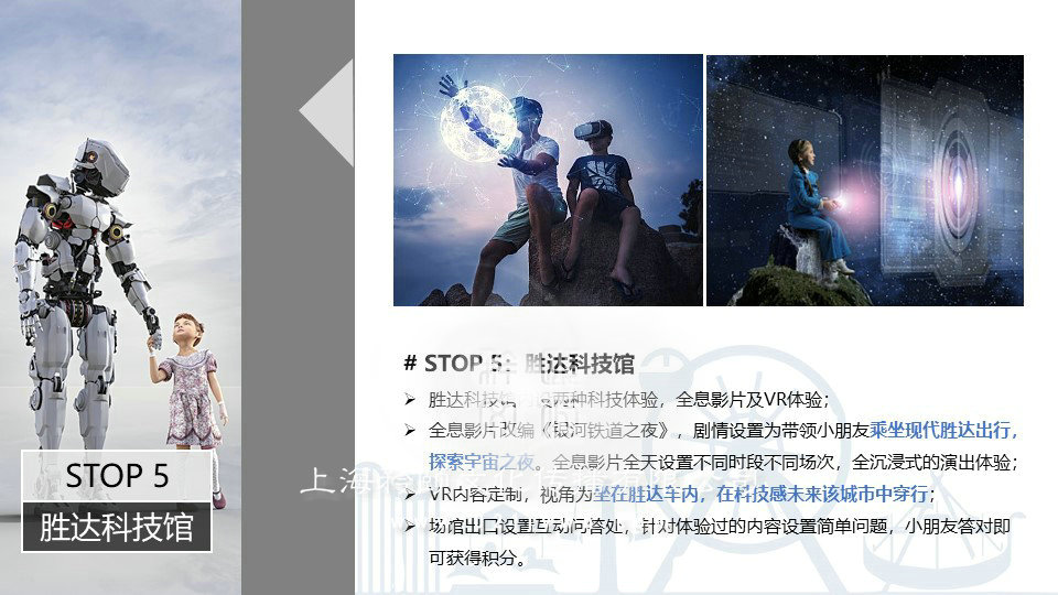 勝達科技館內設兩種科技體驗,全息影片及VR體驗;全息影片改編《銀河鐵道之夜》,上海公關策劃為帶領小朋友乘坐現代勝達出行,探索宇宙之夜。全息影片全天設置不同時段不同場次,全沉浸式的演出體驗;VR內容定制,視角為坐在勝達車內,在科技感未來該城市中穿行;場館出口設置互動問答處,針對體驗過的內容設置簡單問題,小朋友答對即可獲得積分。