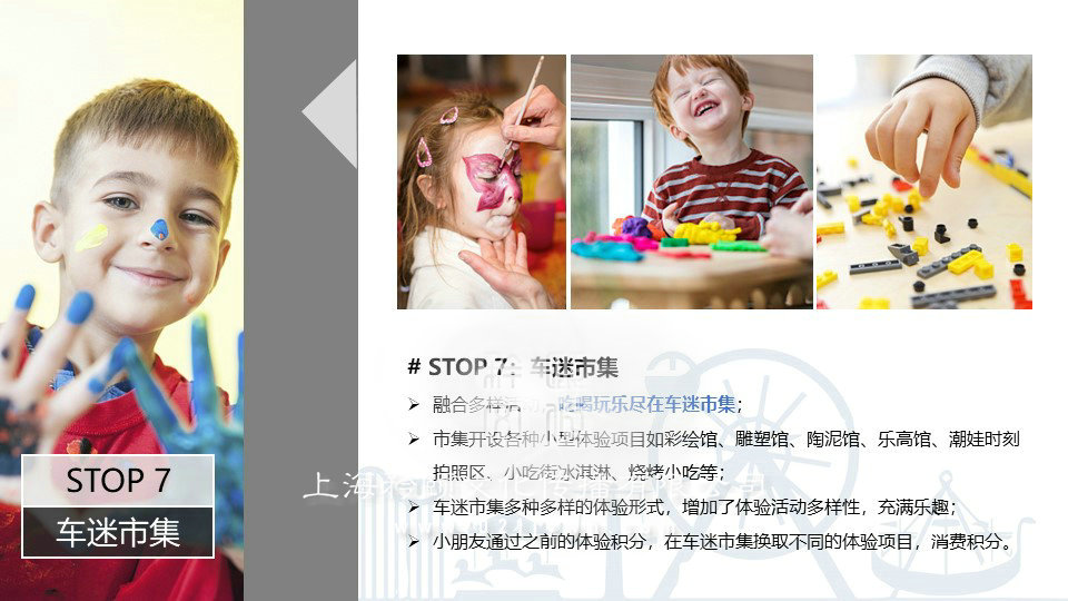 融合多樣活動,吃喝玩樂盡在車迷市集;市集開設各種小型體驗項目如彩繪館、雕塑館、陶泥館、樂高館、潮娃時刻拍照區、小吃街冰淇淋、燒烤小吃等;車迷市集多種多樣的體驗形式,增加了體驗活動多樣性,充滿樂趣;小朋友通過之前的體驗積分,在車迷市集換取不同的體驗項目,消費積分。