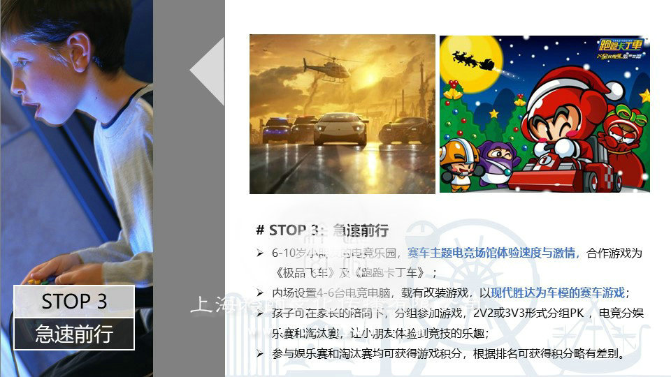 6-10歲小朋友的電競樂園,賽車主題電競場館體驗速度與激情,合作游戲為《極品飛車》及《跑跑卡丁車》 ;內場設置4-6臺電競電腦,載有改裝游戲,以現代勝達為車模的賽車游戲;孩子可在家長的陪同下,分組參加游戲,2V2或3V3形式分組PK ,電競分娛樂賽和淘汰賽,讓小朋友體驗到競技的樂趣;參與娛樂賽和淘汰賽均可獲得游戲積分,根據排名可獲得積分略有差別。