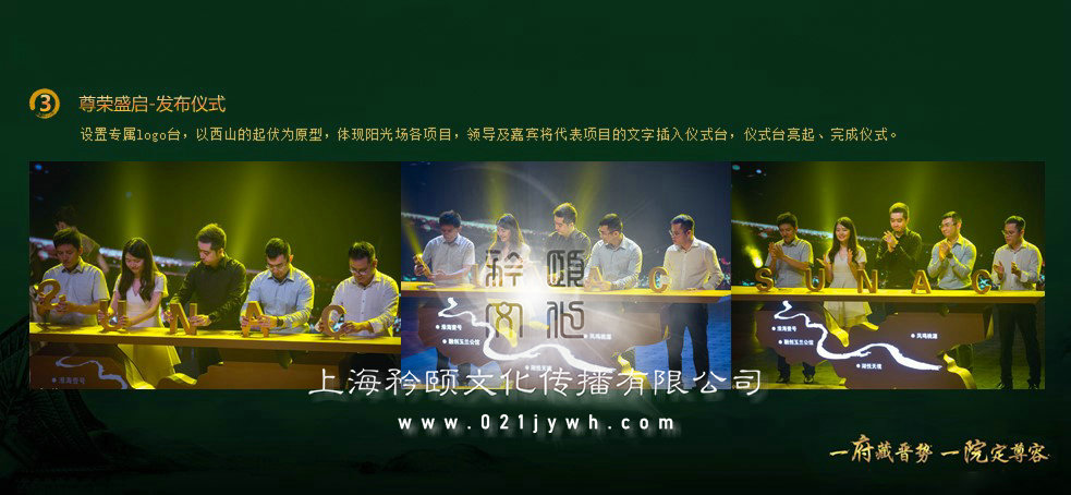 尊榮盛啟-發(fā)布儀式,設(shè)置專屬logo臺,以西山的起伏為原型,體現(xiàn)陽光場各項目,領(lǐng)導及嘉賓將代表項目的文字插入儀式臺,儀式臺亮起、完成儀式。