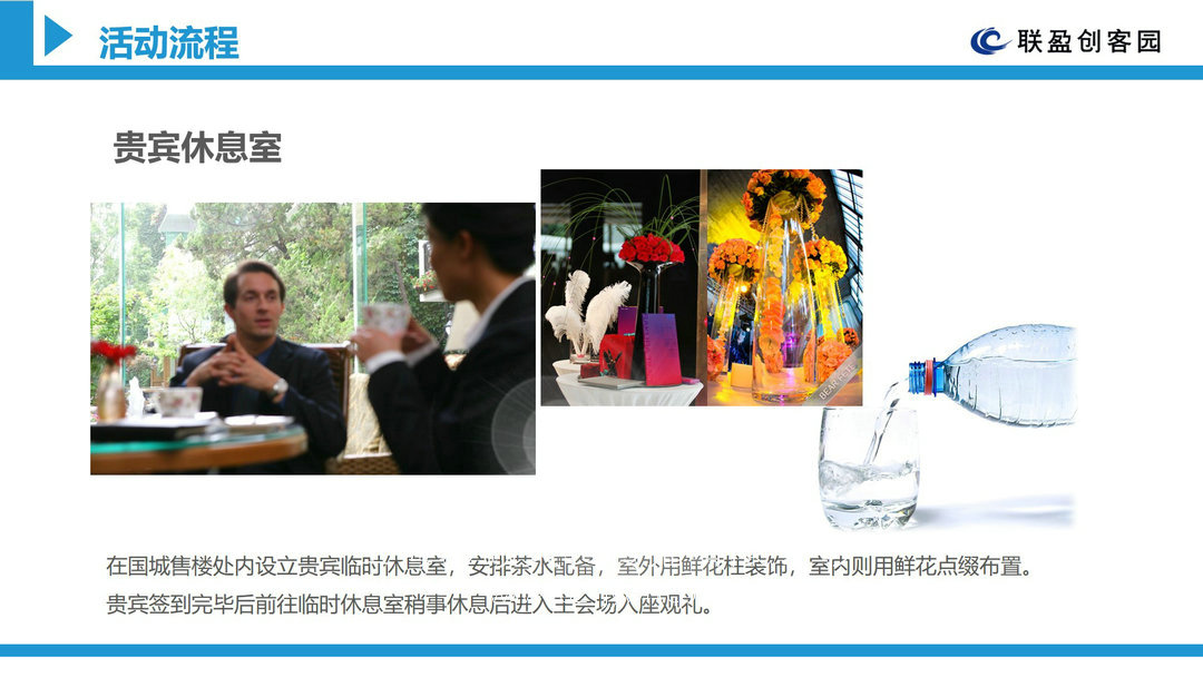 來賓入場禮儀佩戴胸花,簽到環節。在國城售樓處內設立貴賓臨時休息室,安排茶水配備,室外用鮮花柱裝飾,室內則用鮮花點綴布置。貴賓簽到完畢后前往臨時休息室稍事休息后進入主會場入座觀禮。主持人登臺,歡迎所有來賓的蒞臨,盛情邀約全場嘉賓一同見證璀璨時刻,禮儀小姐的引領,企業領導致辭,展望企業未來的美好前景,感謝各位來賓的參與。