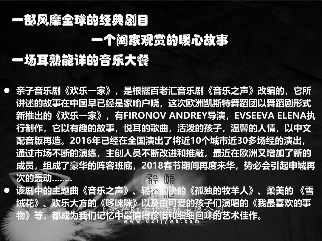 親子音樂劇《歡樂一家》,是根據百老匯音樂劇《音樂之聲》改編的,它所講述的故事在中國早已經是家喻戶曉,這次歐洲凱斯特舞蹈團以舞蹈劇形式新推出的《歡樂一家》,有FIRONOV ANDREY導演,EVSEEVA ELENA執行制作,它以有趣的故事,悅耳的歌曲,活潑的孩子,溫馨的人情,以中文配音版再造。2016年已經在全國演出了將近10個城市近30多場經的演出,通過市場不斷的演練,主創人員不斷改進和推敲,最近在歐洲又增加了新的成員,組成了豪華的陣容班底,2018春節期間再度來華,勢必會引起申城再次的轟動........