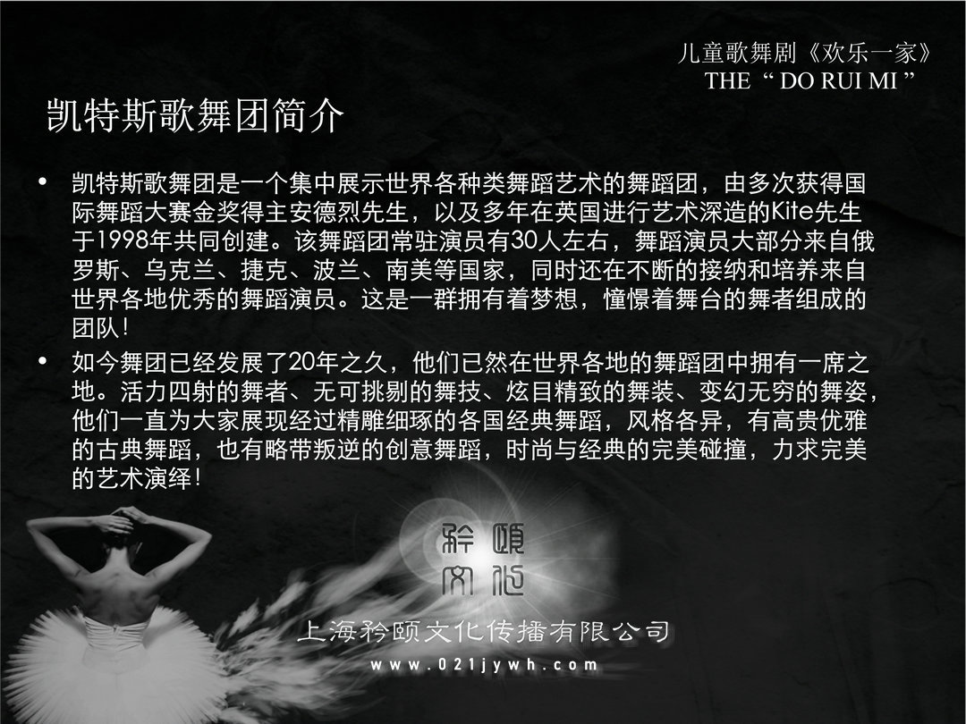 凱特斯歌舞團是一個集中展示世界各種類舞蹈藝術的舞蹈團,由多次獲得國際舞蹈大賽金獎得主安德烈先生,以及多年在英國進行藝術深造的Kite先生于1998年共同創建。該舞蹈團常駐演員有30人左右,舞蹈演員大部分來自俄羅斯、烏克蘭、捷克、波蘭、南美等國家,同時還在不斷的接納和培養來自世界各地優秀的舞蹈演員。這是一群擁有著夢想,憧憬著舞臺的舞者組成的團隊!