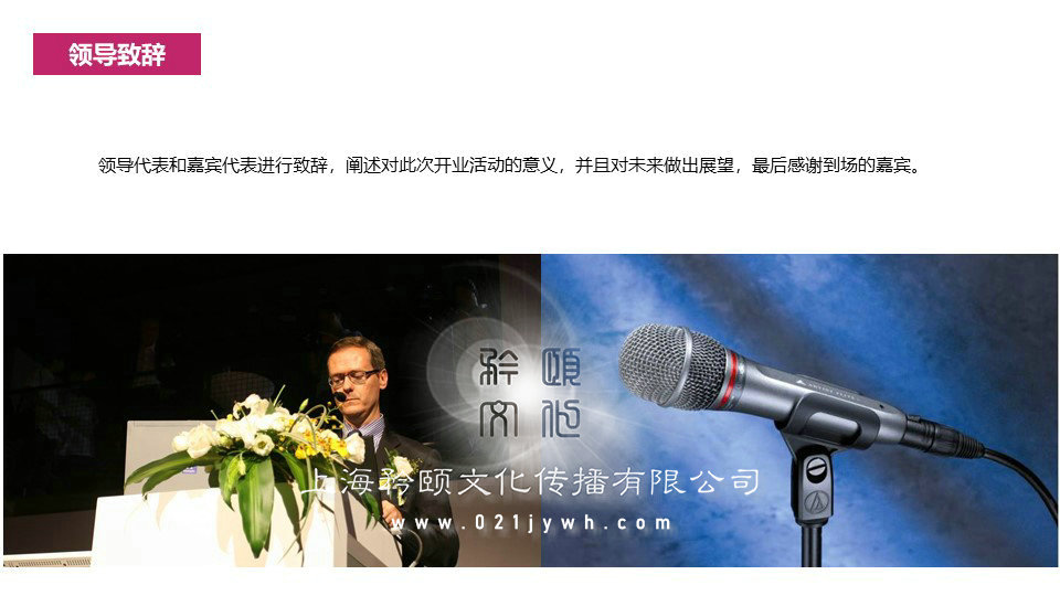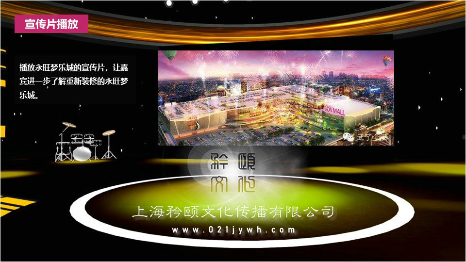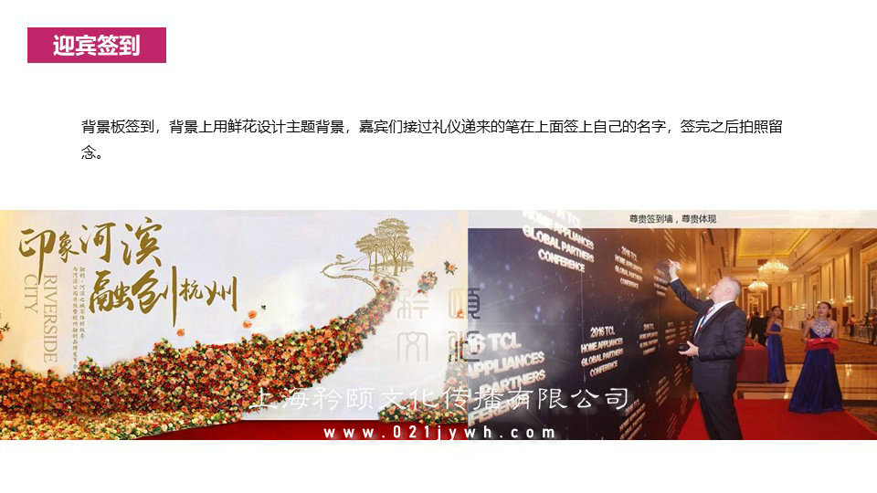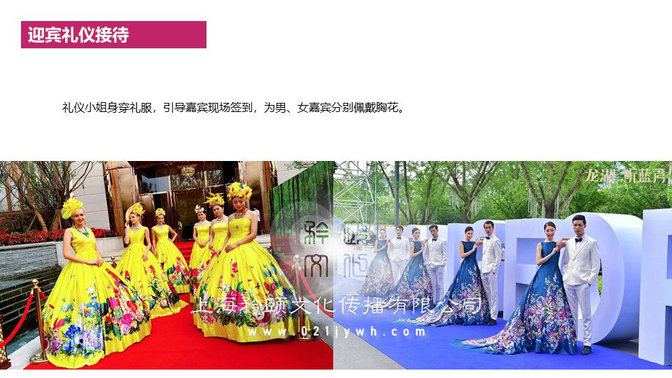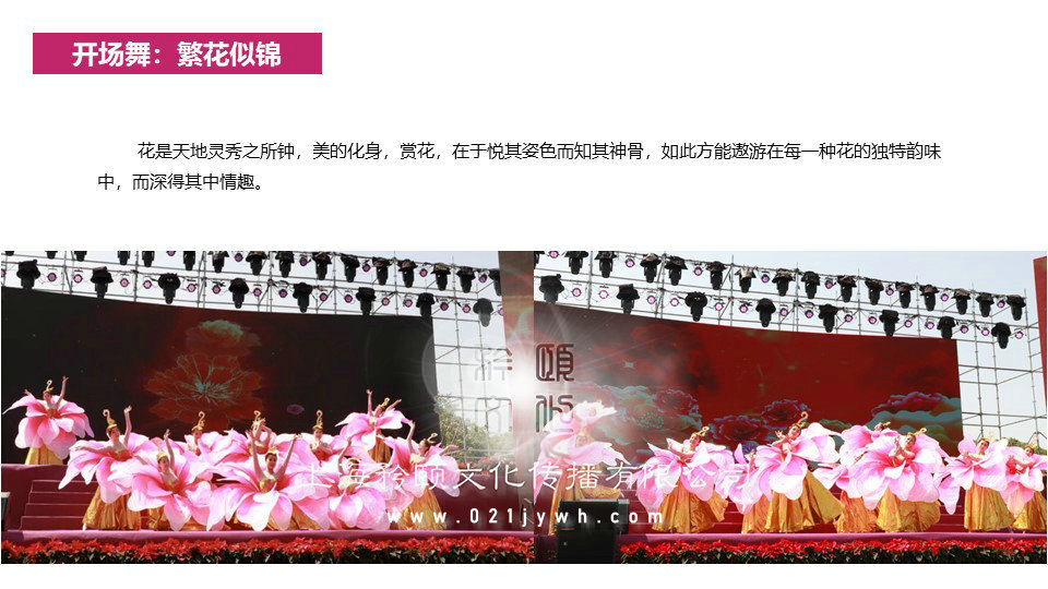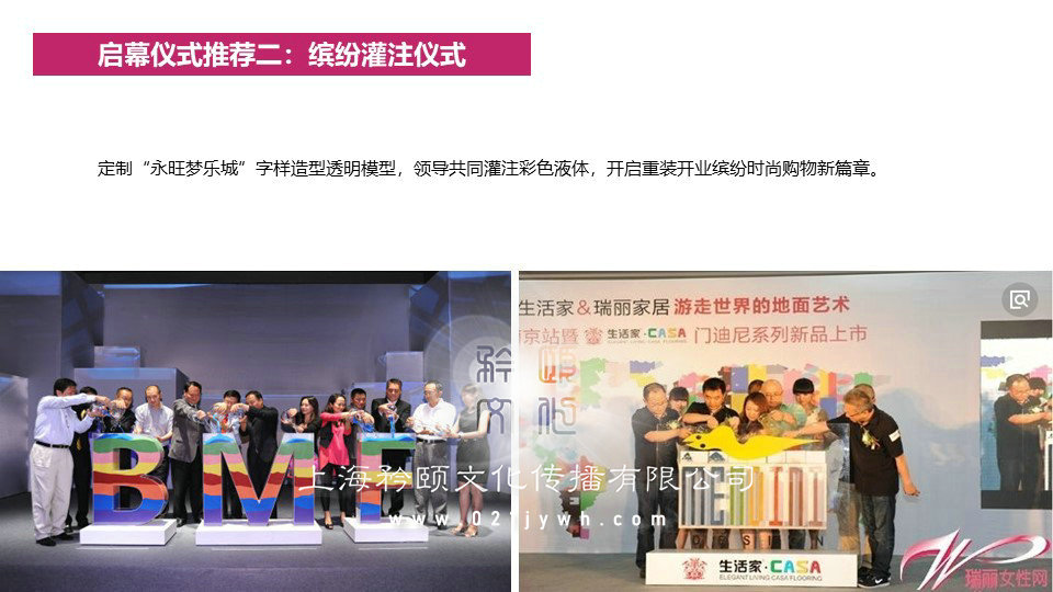 背景板簽到,背景上用鮮花設計主題背景,嘉賓們接過禮儀遞來的筆在上面簽上自己的名字,簽完之后拍照留念。禮儀小姐身穿禮服,引導嘉賓現場簽到,為男、女嘉賓分別佩戴胸花。高樁舞獅迎賓——迎賓通道一側設置高樁舞獅表演吸引人氣及打造喜慶勢氣。播放永旺夢樂城的宣傳片,讓嘉賓進一步了解重新裝修的永旺夢樂城。花是天地靈秀之所鐘,美的化身,賞花,在于悅其姿色而知其神骨,如此方能遨游在每一種花的獨特韻味中,而深得其中情趣。主持人開場,介紹此次活動的主要領導以及活動主題和內容,歡迎廣大嘉賓的到來。領導代表和嘉賓代表進行致辭,闡述對此次開業活動的意義,并且對未來做出展望,最后感謝到場的嘉賓。當啟動嘉賓推倒第一塊時,下面的牌接二連三倒下,寓意著永旺夢樂城開業后發展勢如破竹,一路領先。多米諾骨牌最后一塊連接在大屏幕上,當最后一塊倒下,大屏幕播放永旺夢樂城宣傳片。定制“永旺夢樂城”字樣造型透明模型,領導共同灌注彩色液體,開啟重裝開業繽紛時尚購物新篇章。領導們在舞臺上共同剪彩,大門開啟,有所謂“開業大吉鴻運來,業績功成招福財,大吉興旺財源進,吉開貴門富如海”的美好寓意。儀式結束之后,領導、嘉賓在禮儀的引導下到商場內進行參觀,由專業人士講解商場格局、功能等。儀式結束后祥獅跟隨領導商場巡游,在主力店門前表演助興。