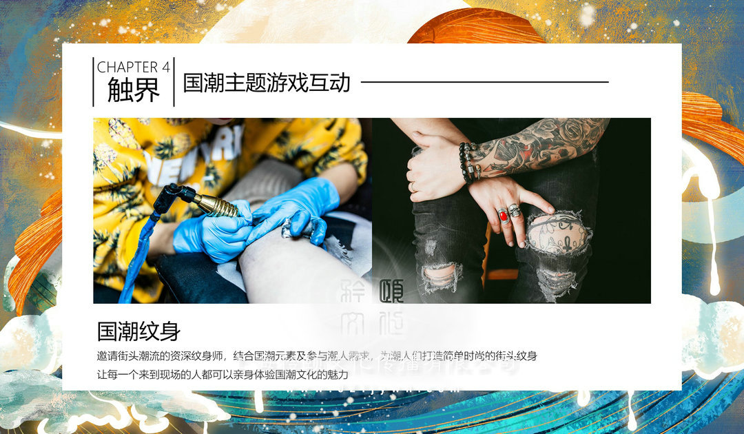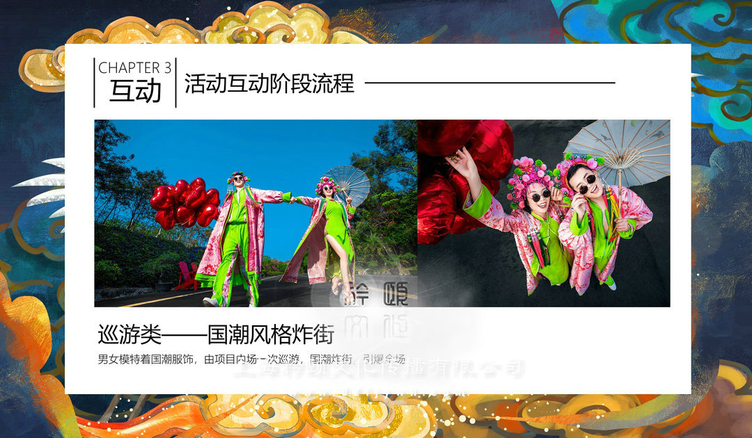 活動內容:在國潮文化節啟幕儀式上,古典文化與現代流行元素上演精彩絕倫的跨界混搭:中國國粹京劇與西方的自由樂派嘻哈相遇,奉上了嘆為觀止的嘻哈京劇開場表演;結合了街舞與電音的吉祥舞獅熱鬧登場。啟幕環節以金沙題寫的匾額為創意,呼應了古時皇帝御筆題匾、懸于門上的儀式感。匾額的題寫標志著開業慶典策劃暨國潮文化節正式啟幕。