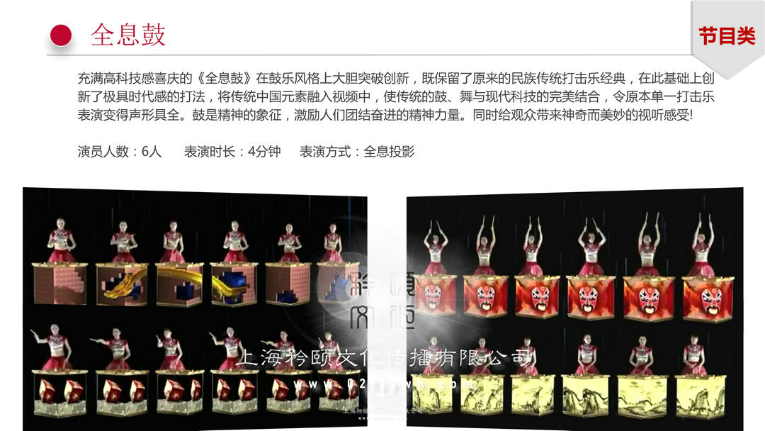 全息鼓節目類,充滿高科技感喜慶的《全息鼓》在鼓樂風格上大膽突破創新,既保留了原來的民族傳統打擊樂經典,在此基礎上創新了極具時代感的打法,將傳統中國元素融入視頻中,使傳統的鼓、舞與現代科技的完美結合,令原本單一打擊樂表演變得聲形具全。鼓是精神的象征,激勵人們團結奮進的精神力量。同時給觀眾帶來神奇而美妙的視聽感受!