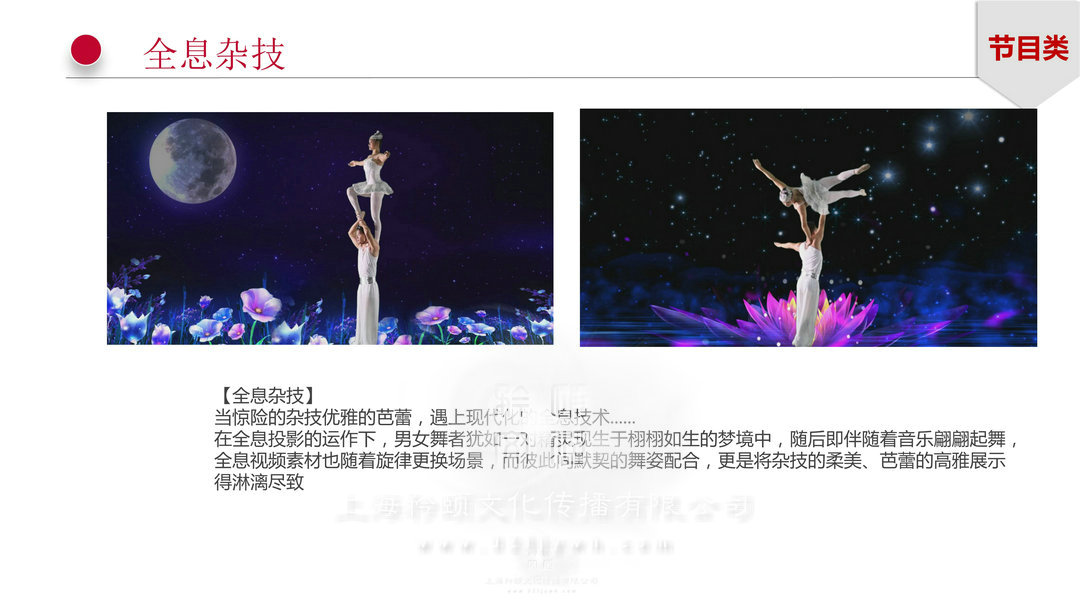 【全息雜技】當驚險的雜技優雅的芭蕾,遇上現代化的全息技術......在全息投影的運作下,男女舞者猶如一對精靈現生于栩栩如生的夢境中,隨后即伴隨著音樂翩翩起舞,全息視頻素材也隨著旋律更換場景,而彼此間默契的舞姿配合,更是將雜技的柔美、芭蕾的高雅展示得淋漓盡致