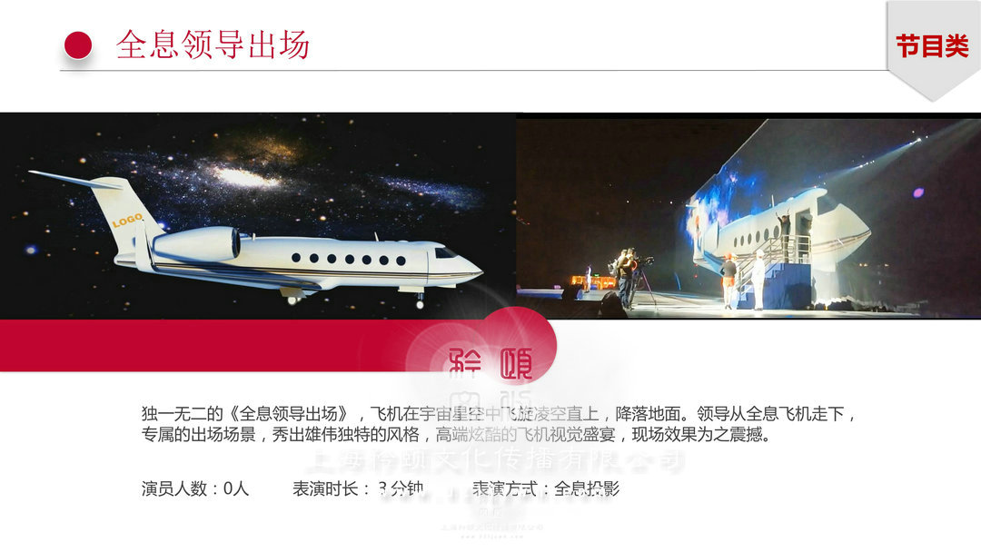 表演方式:全息投影創意全息投影互動視頻秀《科技起航》,舞者隨著動感的音樂與視頻融合一體,新穎的展示,畫面豐富,融入內容廣泛,現場效果極具震撼,扣人心弦。3D光影特效演繹呈現磅礴的科技創新引領商業變革,新模式起航,見證一個新的模式誕生,一種新的創造性的力量的誕生。