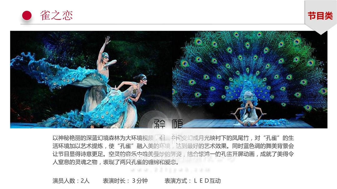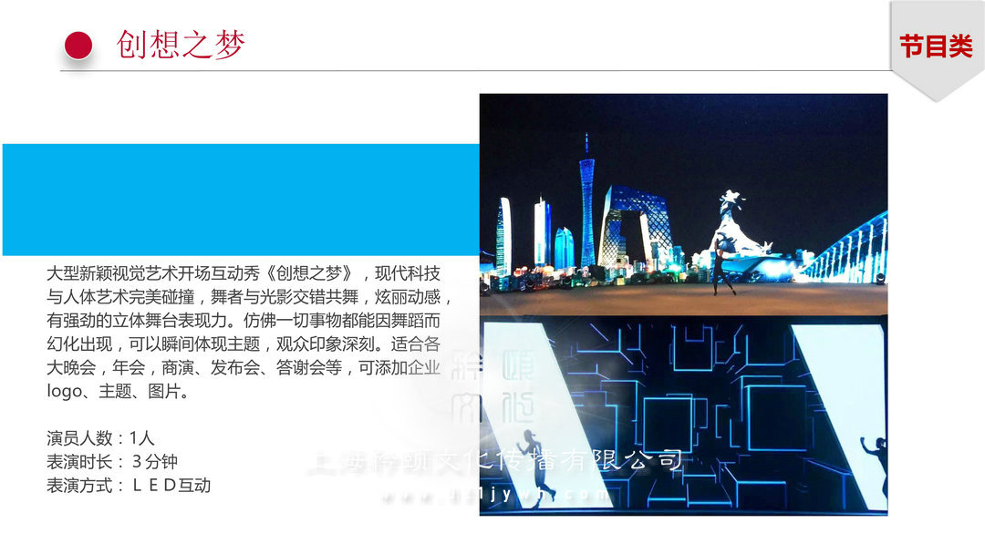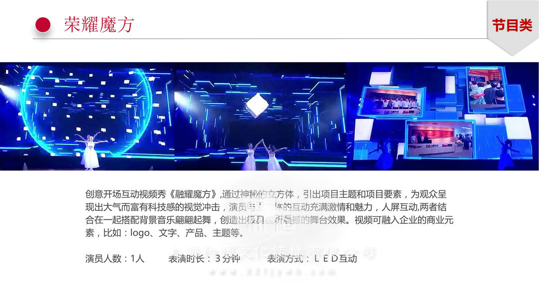 演員人數(shù):3人表演時長:3分鐘    表演方式:LED互動