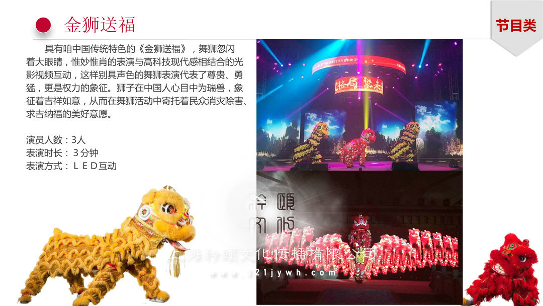 金獅送福節(jié)目類:具有咱中國傳統(tǒng)特色的《金獅送福》,舞獅忽閃著大眼睛,惟妙惟肖的表演與高科技現(xiàn)代感相結(jié)合的光影視頻互動,這樣別具聲色的舞獅表演代表了尊貴、勇猛,更是權(quán)力的象征。獅子在中國人心目中為瑞獸,象征著吉祥如意,從而在舞獅活動中寄托著民眾消災(zāi)除害、求吉納福的美好意愿。