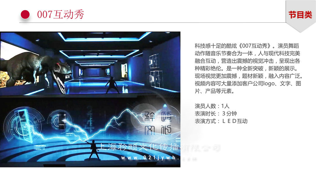 互動秀節(jié)目類:科技感十足的酷炫《007互動秀》。演員舞蹈動作隨音樂節(jié)奏合為一體,人與現(xiàn)代科技完美融合互動,營造出震撼的視覺沖擊,呈現(xiàn)出各種精彩絕倫。是一種全新突破,新穎的展示。現(xiàn)場視覺更加震撼,題材新穎,融入內(nèi)容廣泛。視頻內(nèi)容可大量添加客戶公司logo、文字、圖片、產(chǎn)品等元素。