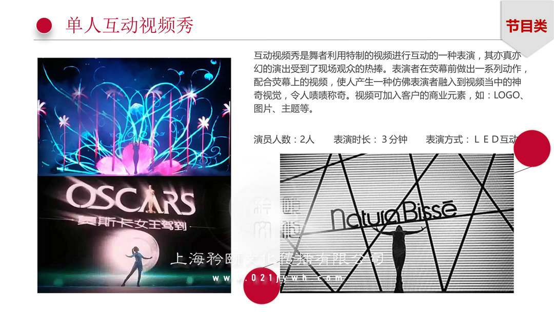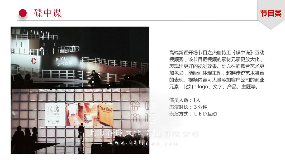 單人互動視頻秀節(jié)目類:互動視頻秀是舞者利用特制的視頻進(jìn)行互動的一種表演,其亦真亦幻的演出受到了現(xiàn)場觀眾的熱捧。表演者在熒幕前做出一系列動作,配合熒幕上的視頻,使人產(chǎn)生一種仿佛表演者融入到視頻當(dāng)中的神奇視覺,令人嘖嘖稱奇。視頻可加入客戶的商業(yè)元素,如:LOGO、圖片、主題等。