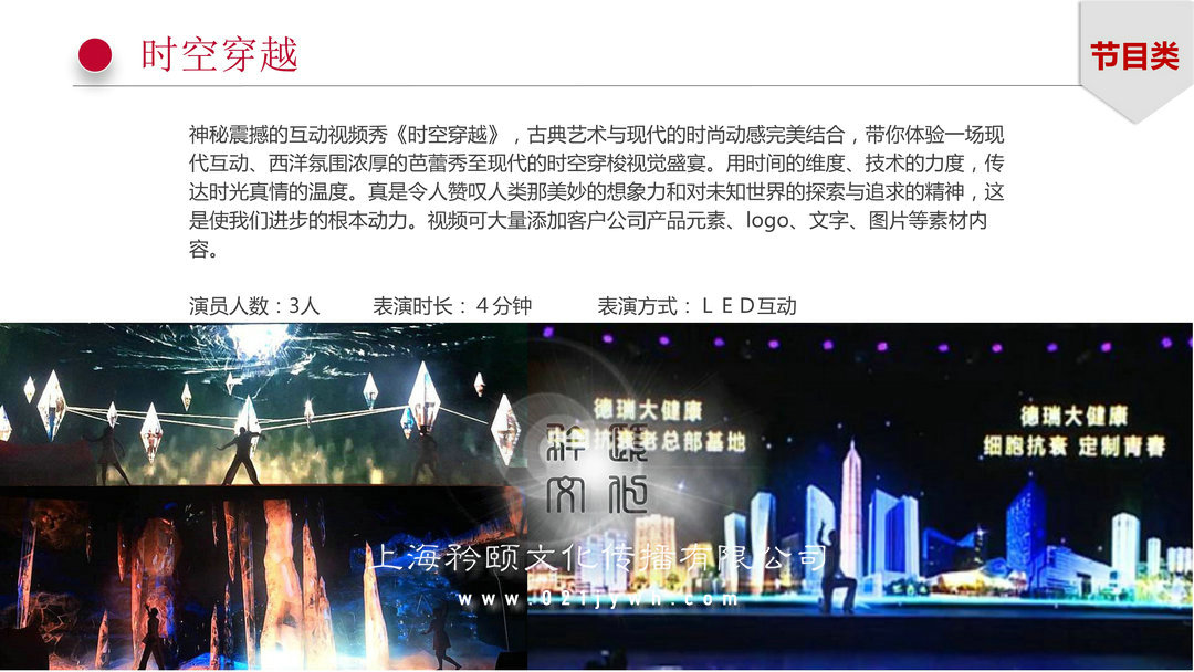 時空穿越節(jié)目類:神秘震撼的互動視頻秀《時空穿越》,古典藝術(shù)與現(xiàn)代的時尚動感完美結(jié)合,帶你體驗一場現(xiàn)代互動、西洋氛圍濃厚的芭蕾秀至現(xiàn)代的時空穿梭視覺盛宴。用時間的維度、技術(shù)的力度,傳達(dá)時光真情的溫度。真是令人贊嘆人類那美妙的想象力和對未知世界的探索與追求的精神,這是使我們進(jìn)步的根本動力。視頻可大量添加客戶公司產(chǎn)品元素、logo、文字、圖片等素材內(nèi)容。