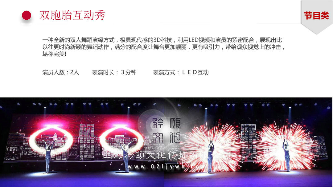 雙胞胎互動秀節(jié)目類:一種全新的雙人舞蹈演繹方式,極具現(xiàn)代感的3D科技,利用LED視頻和演員的緊密配合,展現(xiàn)出比以往更時尚新穎的舞蹈動作,滿分的配合度讓舞臺更加靚麗,更有吸引力,帶給觀眾視覺上的沖擊,堪稱完美!