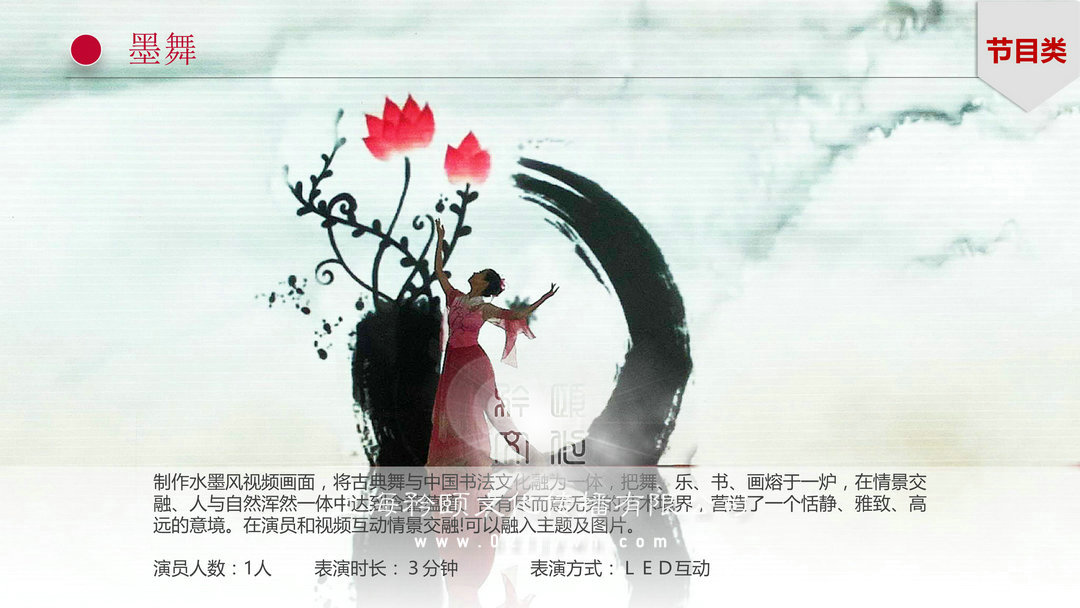 墨舞節(jié)目類:制作水墨風(fēng)視頻畫面,將古典舞與中國書法文化融為一體,把舞、樂、書、畫熔于一爐,在情景交融、人與自然渾然一體中達(dá)到含蓄蘊藉、言有盡而意無窮的藝術(shù)境界,營造了一個恬靜、雅致、高遠(yuǎn)的意境。在演員和視頻互動情景交融!可以融入主題及圖片。