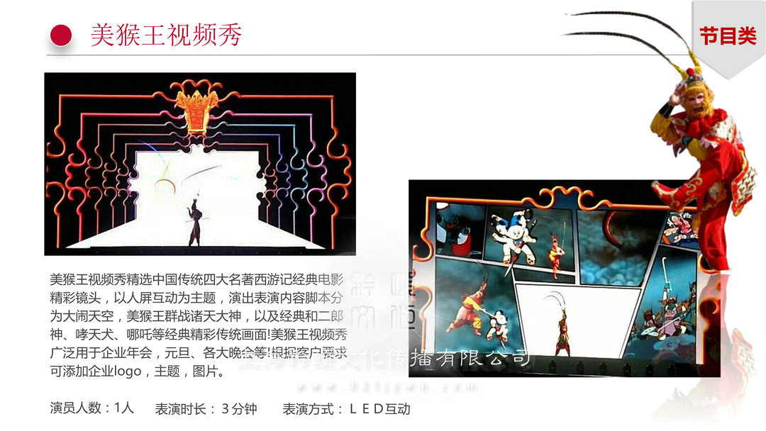 美猴王視頻秀節(jié)目類:美猴王視頻秀精選中國傳統(tǒng)四大名著西游記經(jīng)典電影精彩鏡頭,以人屏互動為主題,演出表演內(nèi)容腳本分為大鬧天空,美猴王群戰(zhàn)諸天大神,以及經(jīng)典和二郎神、哮天犬、哪吒等經(jīng)典精彩傳統(tǒng)畫面!美猴王視頻秀廣泛用于企業(yè)年會,元旦、各大晚會等!根據(jù)客戶要求可添加企業(yè)logo,主題,圖片。