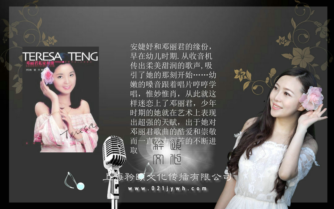 老上海的優雅,動聽,唯美都在她的歌聲里呈現!安婕妤和鄧麗君的緣份,早在幼兒時期.從收音機傳出柔美甜潤的歌聲,吸引了她的那刻開始……幼嫩的嗓音跟著唱片哼哼學唱,惟妙惟肖,從此就這樣迷戀上了鄧麗君,少年時期的她就在藝術上表現出超強的天賦,出于她對鄧麗君歌曲的酷愛和崇敬而一直努力刻苦的不斷進取