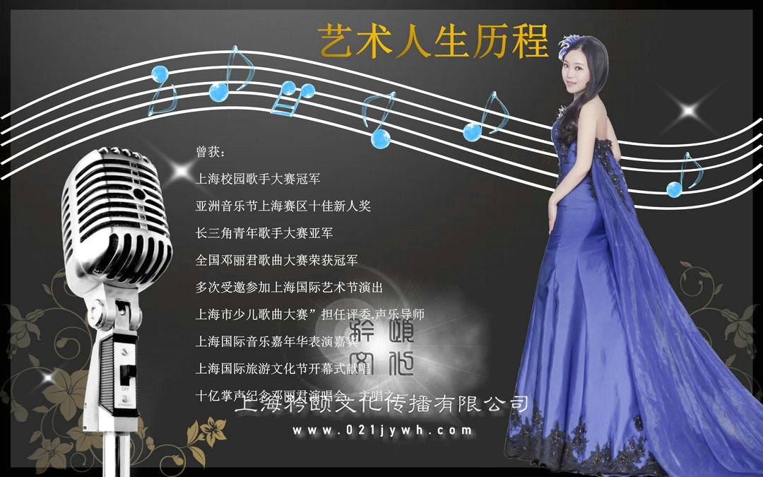 曾獲:亞洲音樂節上海賽區十佳新人獎、長三角青年歌手大賽亞軍、全國鄧麗君歌曲大賽榮獲冠軍、多次受邀參加上海國際藝術節演出、上海市少兒歌曲大賽”擔任評委.聲樂導師、上海國際音樂嘉年華表演嘉賓、上海國際旅游文化節開幕式獻唱、十億掌聲紀念鄧麗君演唱會,主唱之一