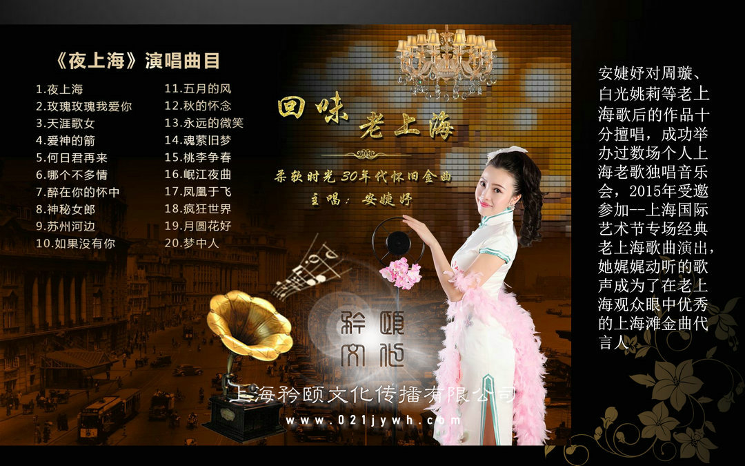 •老上海歌手鄧麗君模仿者有著五月玫瑰般甜美的外表,從小熱愛藝術,聲樂表演科班出生,師從多位聲樂名家,17歲時參加寶島臺灣海峽兩岸文化交流演出,其細膩甜蜜的唱腔,深深打動了在場每位觀眾,且能用標準的國語、日語、英語、粵語、閩南語等多種語言演唱安婕妤對周璇、白光姚莉等老上海歌后的作品十分擅唱,成功舉辦過數場個人上海老歌獨唱音樂會,2015年受邀參加--上海國際藝術節專場經典老上海歌曲演出,她娓娓動聽的歌聲成為了在老上海觀眾眼中優秀的上海灘金曲代言人原汁原味老上海歌手