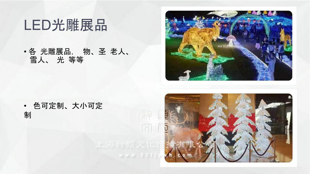 冰雕展•夏季冰雪來 ,享受從夏季穿越到冬季的感 •夏季冰雪來 :承接大型冰雕 、冰雪 園、房地 、商 冰屋定制•可根據 地大小定制,客 可提供 案定制, 色定制, 目定制LED光雕展品•各 光雕展品, 物、圣 老人、雪人、 光 等等