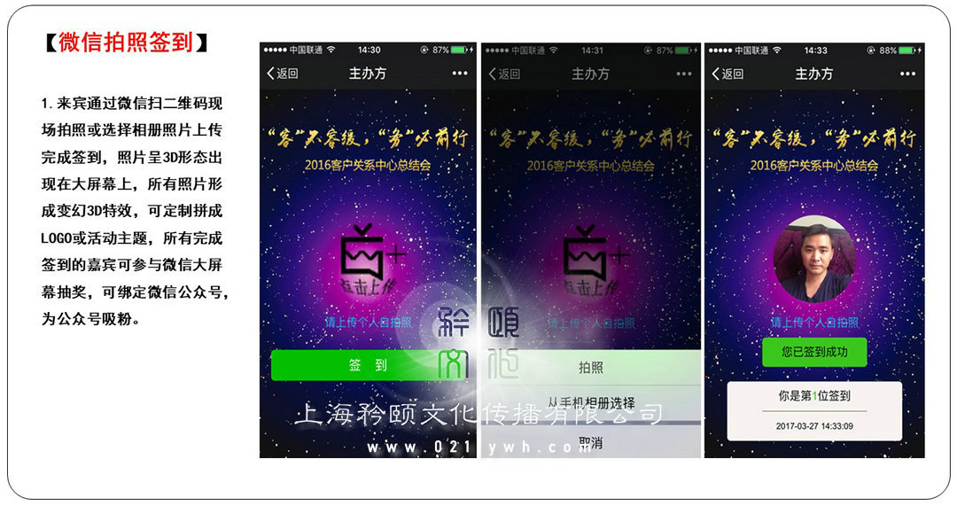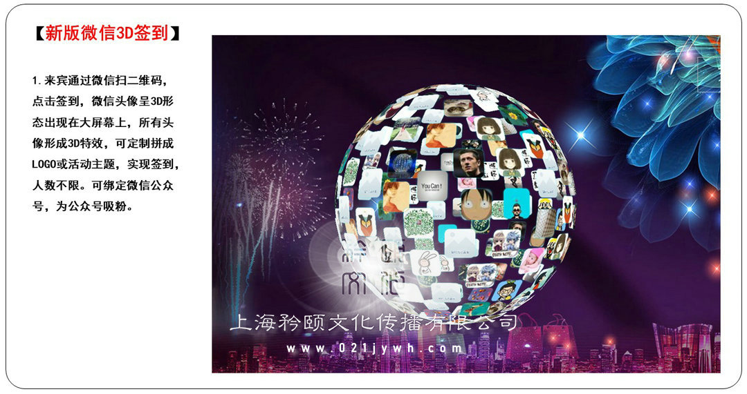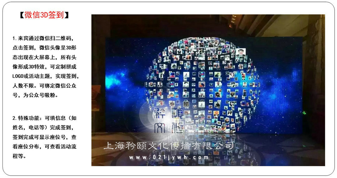 1.來賓通過微信掃二維碼,點擊簽到,微信頭像呈3D形態出現在大屏幕上,所有頭像形成3D特效,可定制拼成LOGO或活動主題,實現簽到,人數不限??山壎ㄎ⑿殴娞枺瑸楣娞栁?。2.特殊功能:可填信息(如姓名,電話等)完成上海微信簽到,簽到完成可顯示座位號,查看座位分布,可查看活動流程等。