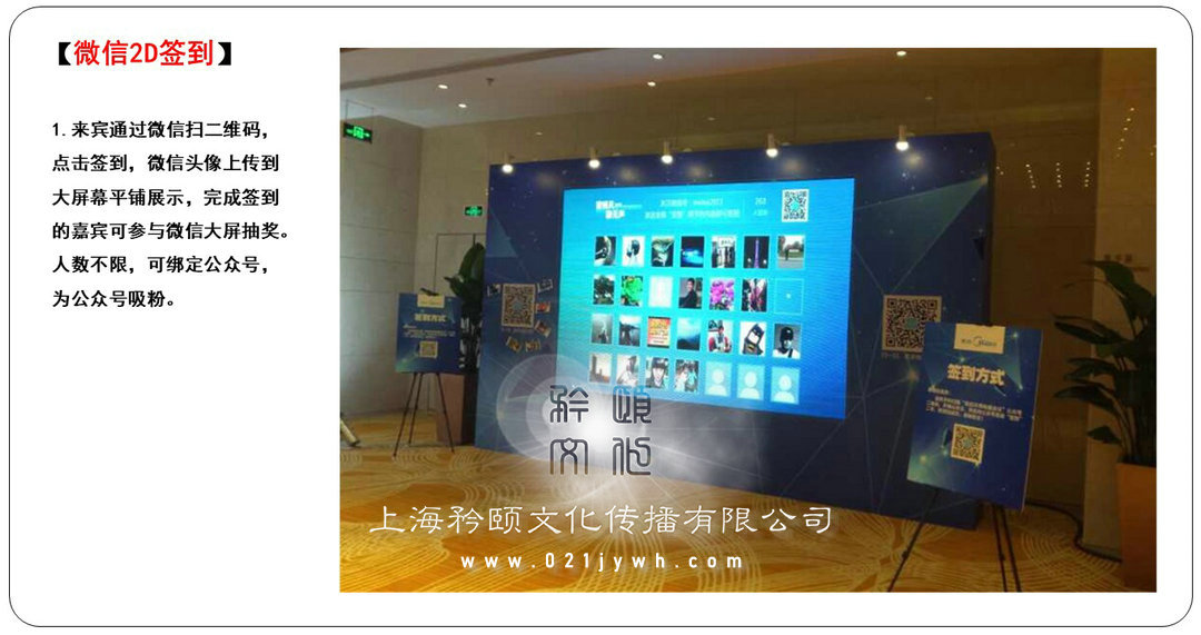 1.來賓通過微信掃二維碼,點擊簽到,微信頭像上傳到大屏幕平鋪展示,完成簽到的嘉賓可參與微信大屏抽獎。人數不限,可綁定公眾號,為公眾號吸粉。