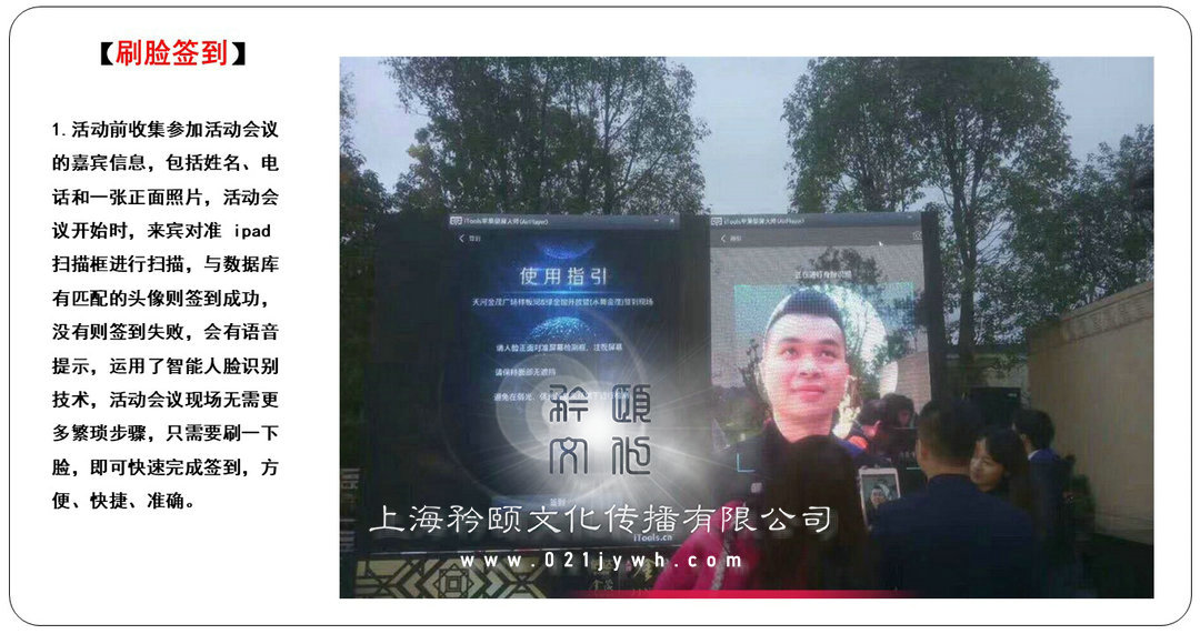 1.活動前收集參加活動會議的嘉賓信息,包括姓名、電話和一張正面照片,活動會議開始時,來賓對準 ipad 掃描框進行掃描,與數據庫有匹配的頭像則簽到成功,沒有則簽到失敗,會有語音提示,運用了智能人臉識別技術,活動會議現場無需更多繁瑣步驟,只需要刷一下臉,即可快速完成簽到,方便、快捷、準確。
