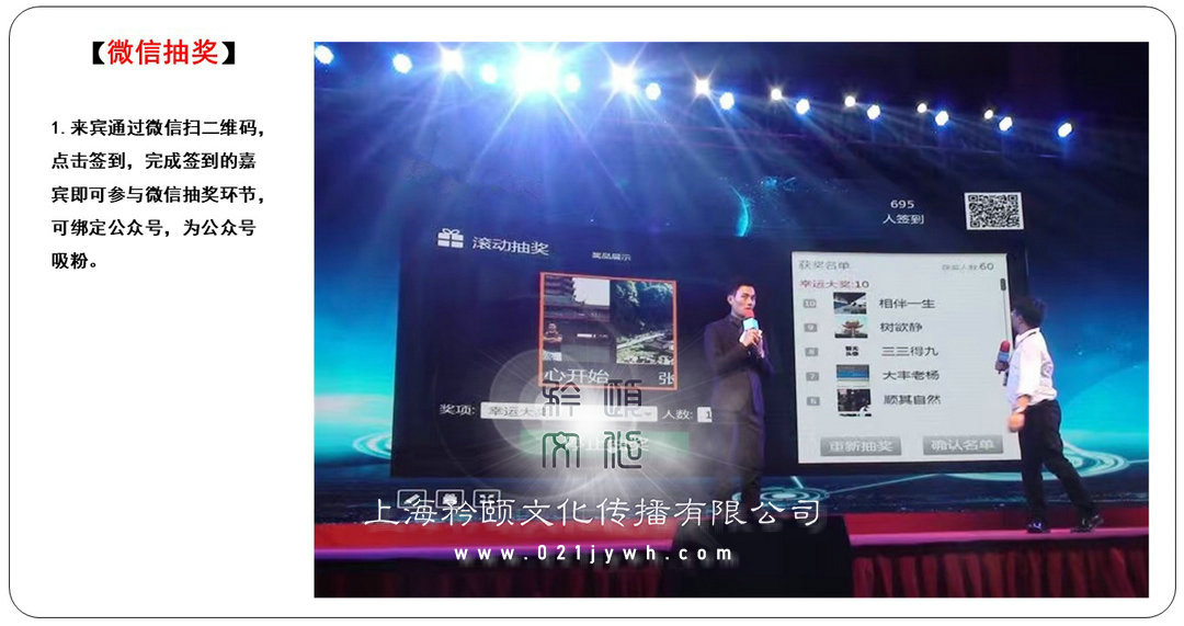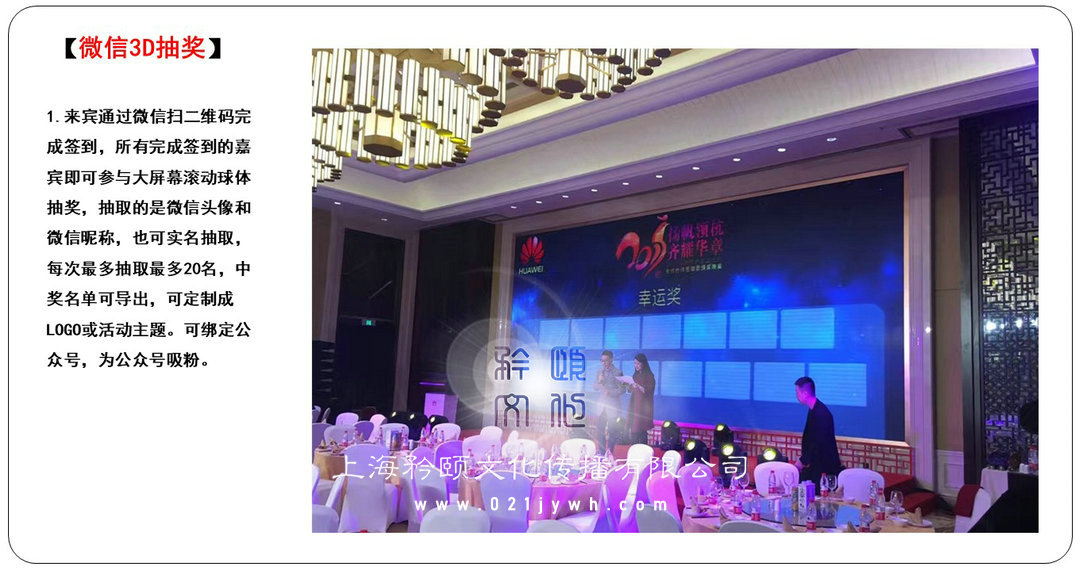 1.來賓通過微信掃二維碼完成簽到,所有完成簽到的嘉賓即可參與大屏幕滾動球體抽獎,抽取的是微信頭像和微信昵稱,也可實名抽取,每次最多抽取最多20名,中獎名單可導出,可定制成LOGO或上海年會活動主題。可綁定公眾號,為公眾號吸粉。