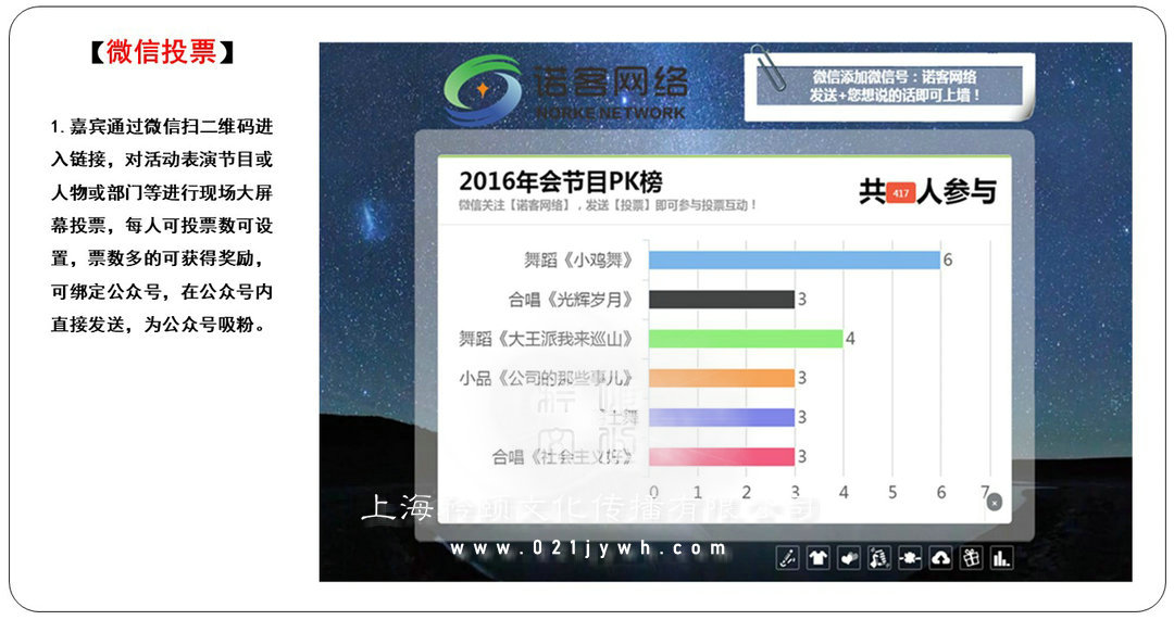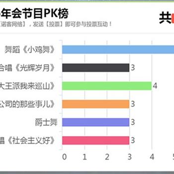1.嘉賓通過微信掃二維碼進入鏈接,對活動表演節目或人物或部門等進行現場大屏幕投票,每人可投票數可設置,票數多的可獲得獎勵,可綁定公眾號,在公眾號內直接發送,為公眾號吸粉。