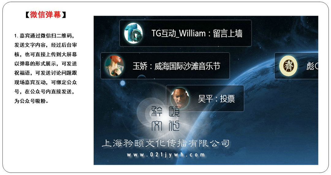 1.嘉賓通過微信掃二維碼,發送文字內容,經過后臺審核,也可直接上傳到大屏幕以彈幕的形式展示,可發送祝福語,可發送討論問題跟現場嘉賓互動,可綁定公眾號,在公眾號內直接發送,為公眾號吸粉。