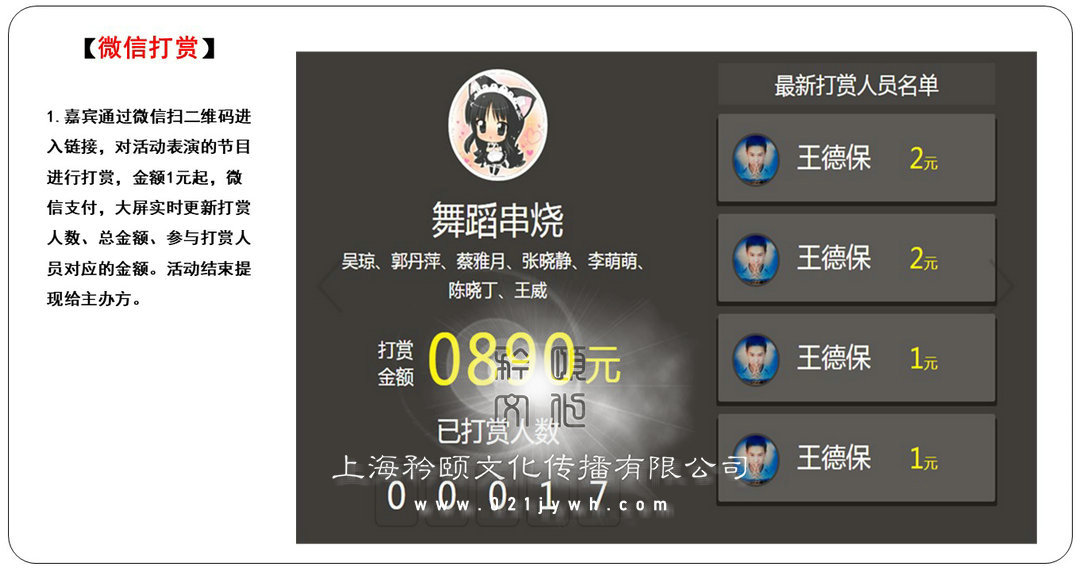 1.嘉賓通過微信掃二維碼進入鏈接,上海年會公司對活動表演的節目進行打賞,金額1元起,微信支付,大屏實時更新打賞人數、總金額、參與打賞人員對應的金額。活動結束提現給主辦方。