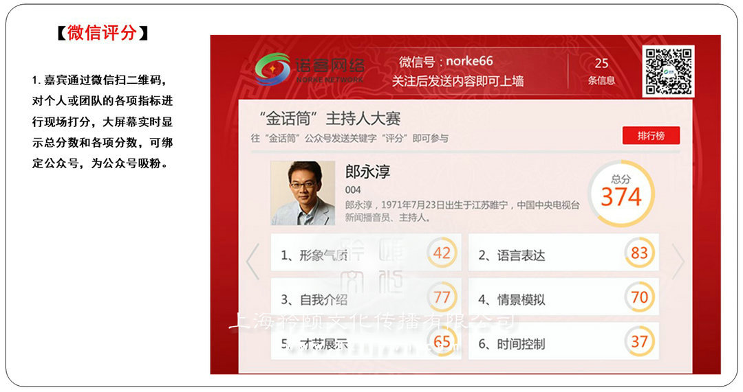 1.嘉賓通過微信掃二維碼,對個人或團隊的各項指標進行現場打分,大屏幕實時顯示總分數和各項分數,可綁定公眾號,為公眾號吸粉。