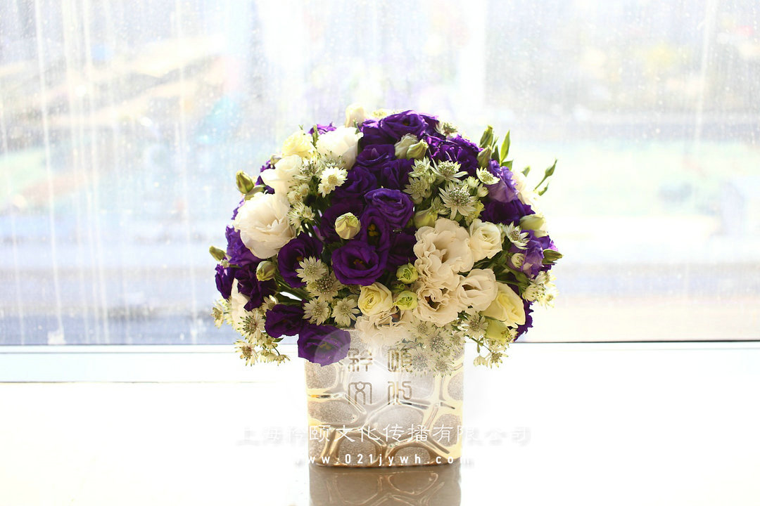 現(xiàn)場擺放效果:優(yōu)雅豪華的造型,采用大量的花材,集團式插法,對結(jié)構(gòu),對比要求比較低,呈自然的圓潤感。