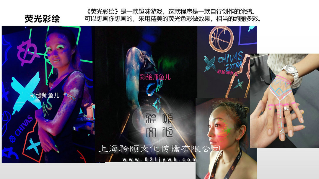 •美術(shù)12年專業(yè)、接車展、珠寶展各種奢侈品牌商業(yè)彩繪繪畫、人體彩繪(熒光),ipad插畫,海娜紋身,油畫,國畫,墻繪,手繪涂鴉T恤,Q版人物繪畫活動。團(tuán)隊(duì)負(fù)責(zé)彩繪師魚兒(彩繪工作室10人)合作對象:寶馬車展畫師,嬌詩韻專柜畫師,