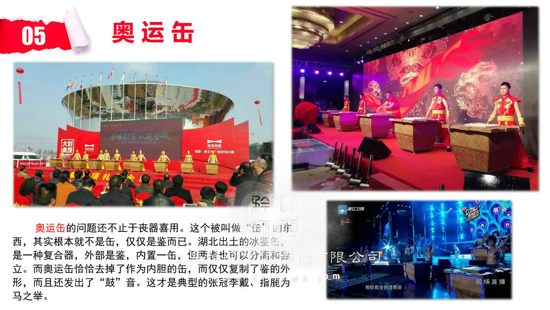 奧運(yùn)缶的問(wèn)題還不止于喪器喜用。這個(gè)被叫做“缶”的東西,其實(shí)根本就不是缶,僅僅是鑒而已。湖北出土的冰鑒缶,是一種復(fù)合器,外部是鑒,內(nèi)置一缶,但兩者也可以分離和獨(dú)立。而奧運(yùn)缶恰恰去掉了作為內(nèi)膽的缶,而僅僅復(fù)制了鑒的外形,而且還發(fā)出了“鼓”音。這才是典型的張冠李戴、指鹿為馬之舉。