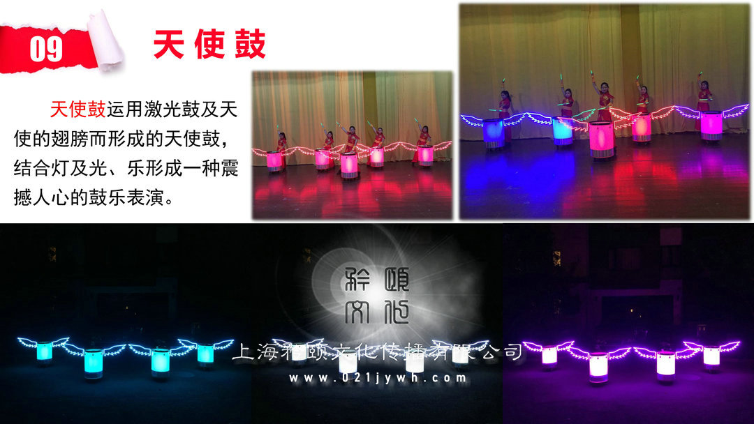 天使鼓運(yùn)用激光鼓及天使的翅膀而形成的天使鼓,結(jié)合燈及光、樂(lè)形成一種震撼人心的鼓樂(lè)表演。