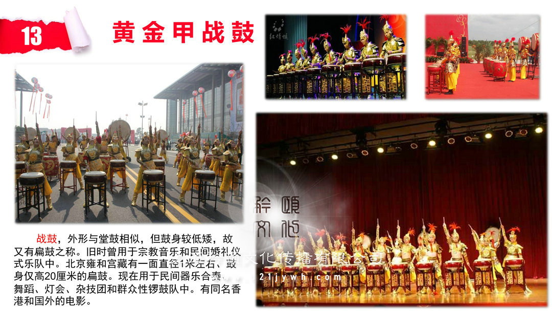 身僅高20厘米的扁鼓。現(xiàn)在用于民間器樂(lè)合奏、舞蹈、燈會(huì)、雜技團(tuán)和群眾性鑼鼓隊(duì)中。有同名香港和國(guó)外的電影。