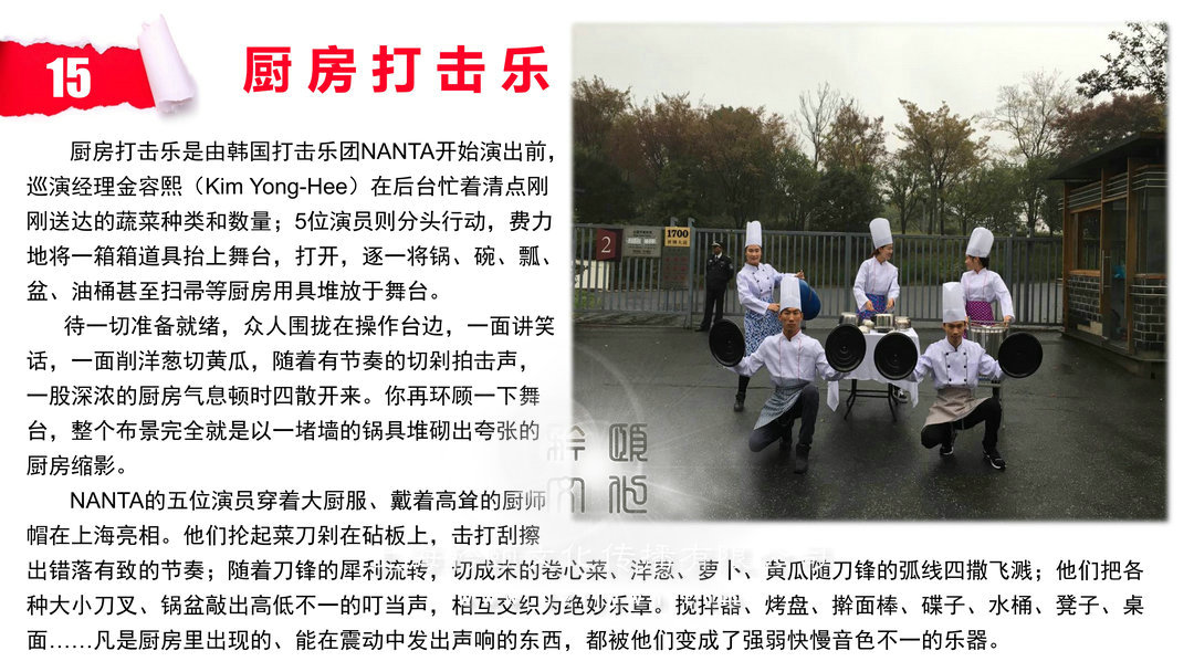 NANTA的五位演員穿著大廚服、戴著高聳的廚師帽在上海亮相。他們掄起菜刀剁在砧板上,擊打刮擦