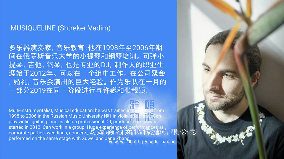 Multi-instrumentalist, Musical education: he was trained in the period from1998 to 2006 in the Russian Music University №1 in violin and piano. Canplay violin, guitar, piano, is also a professional DJ, producer career wasstarted in 2012. Can work in a group. Huge experience of performances atcorporate parties, weddings, concerts. As part of the band in January 2019performed on the same stage with Xuwei and Jane Zhang.
