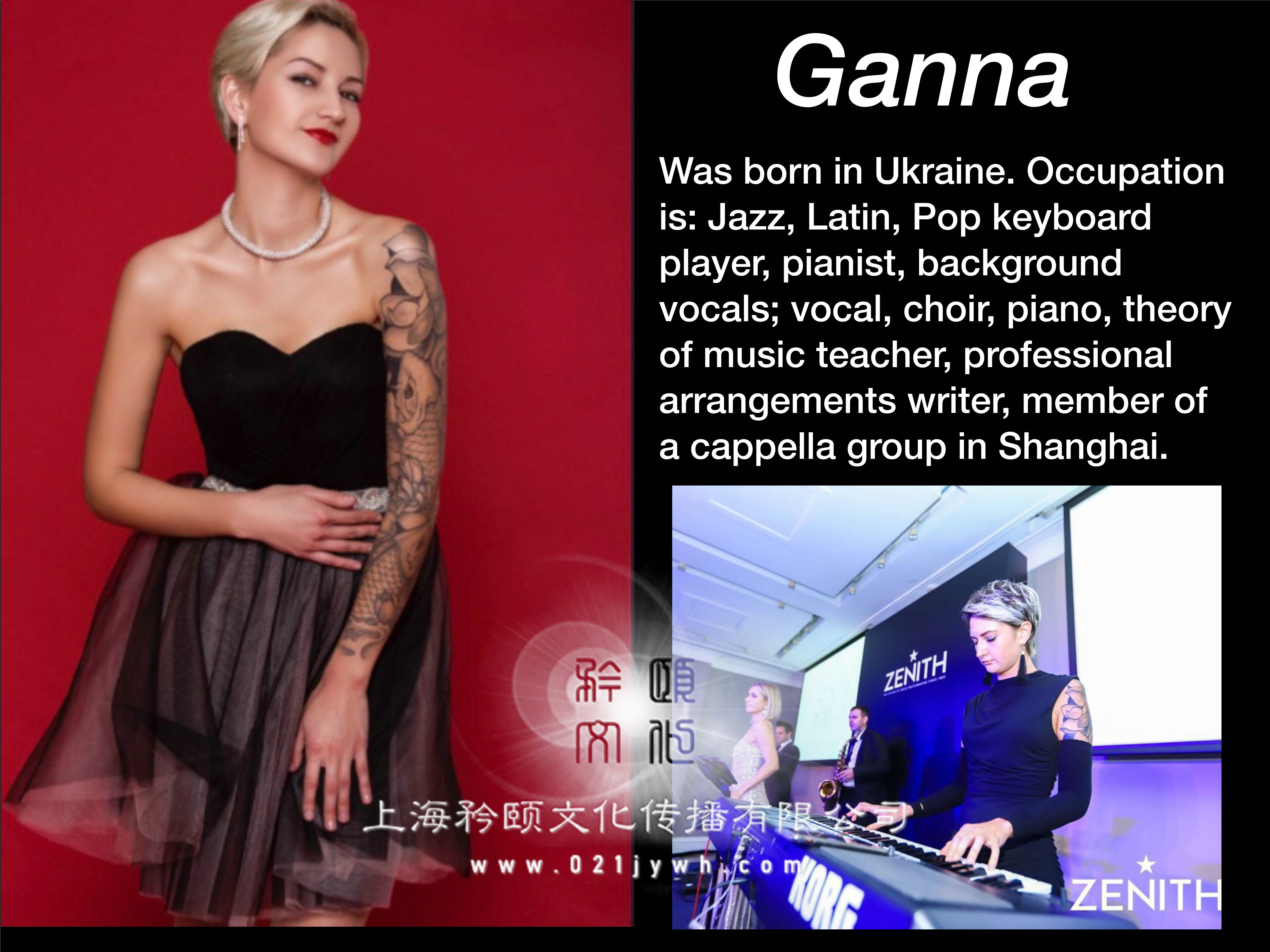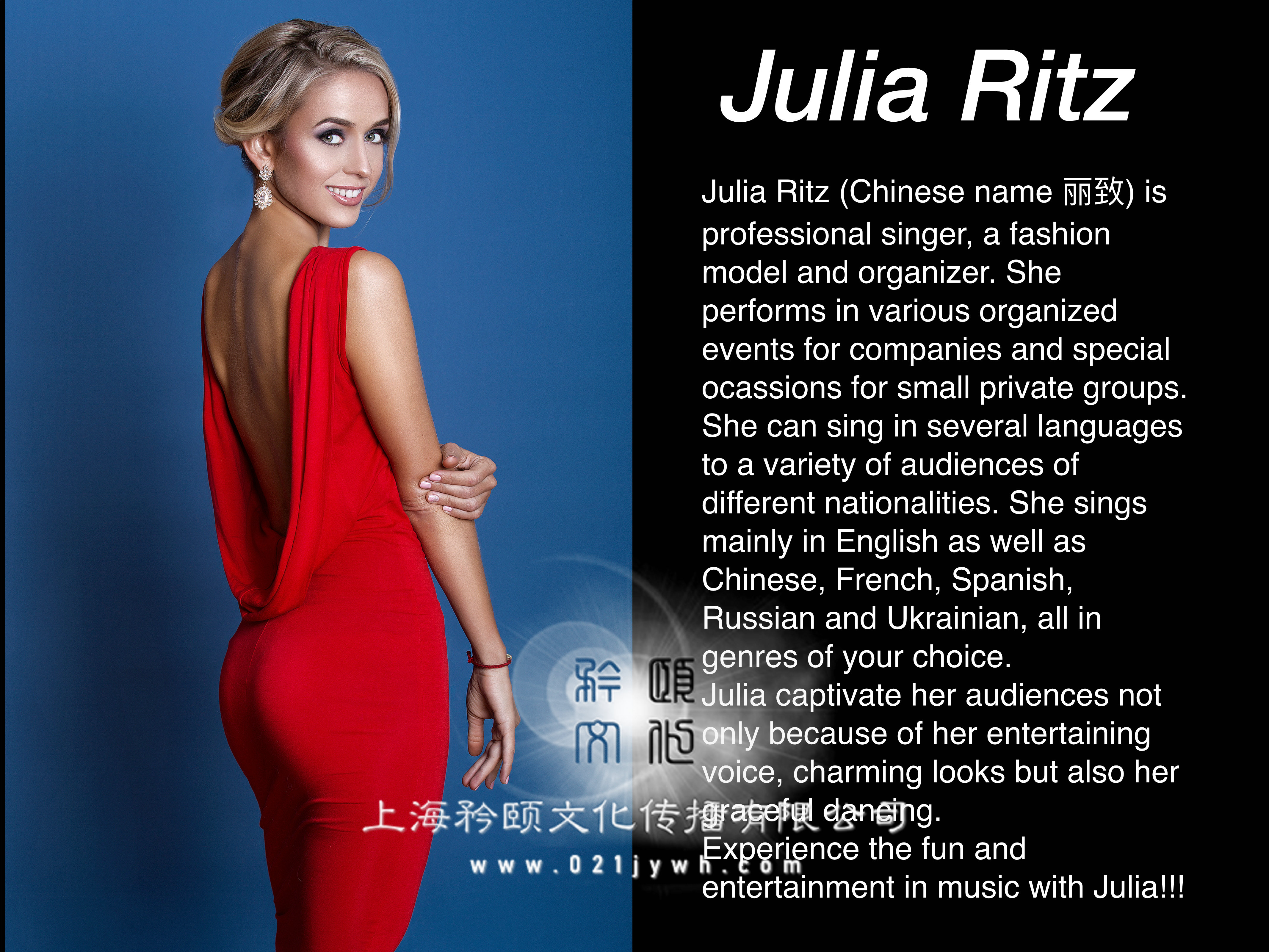 朱莉婭·麗茲是外籍樂隊的主唱,同時也是一位專業歌手、時裝模特和組織者。她為公司和小型私人團體在不同的組織活動中演出,能用多種語言為不同國籍的觀眾演唱。她不僅會說英語,還會說漢語、法語、西班牙語、俄語和烏克蘭語,她像天才一樣。
