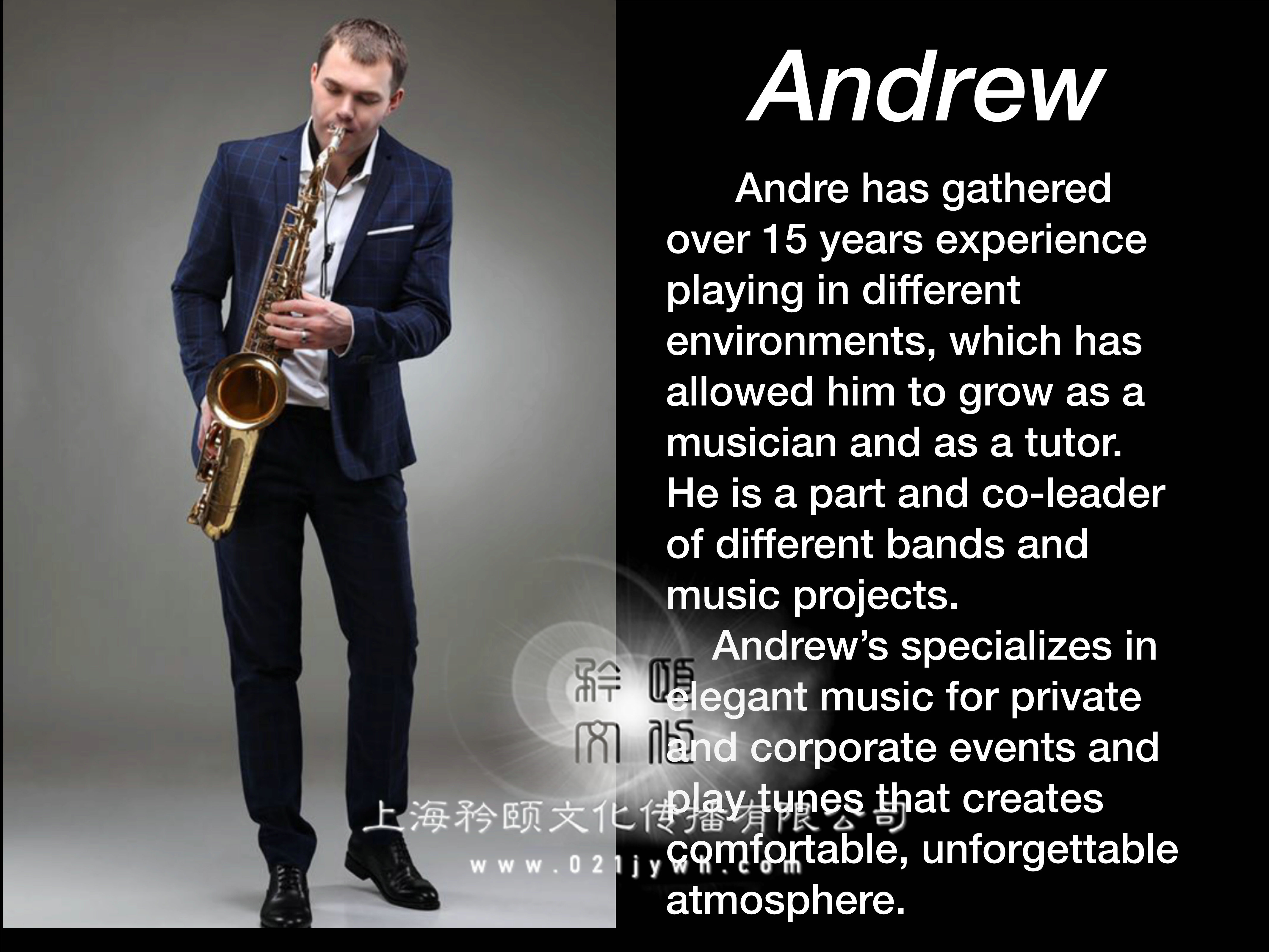 安德烈是上海外籍樂隊的薩克斯手,在不同的環境中工作了15年以上,這使他成為了一個有趣的人和一個家庭教師,他是不同樂隊和音樂項目的一部分和共同領導者。