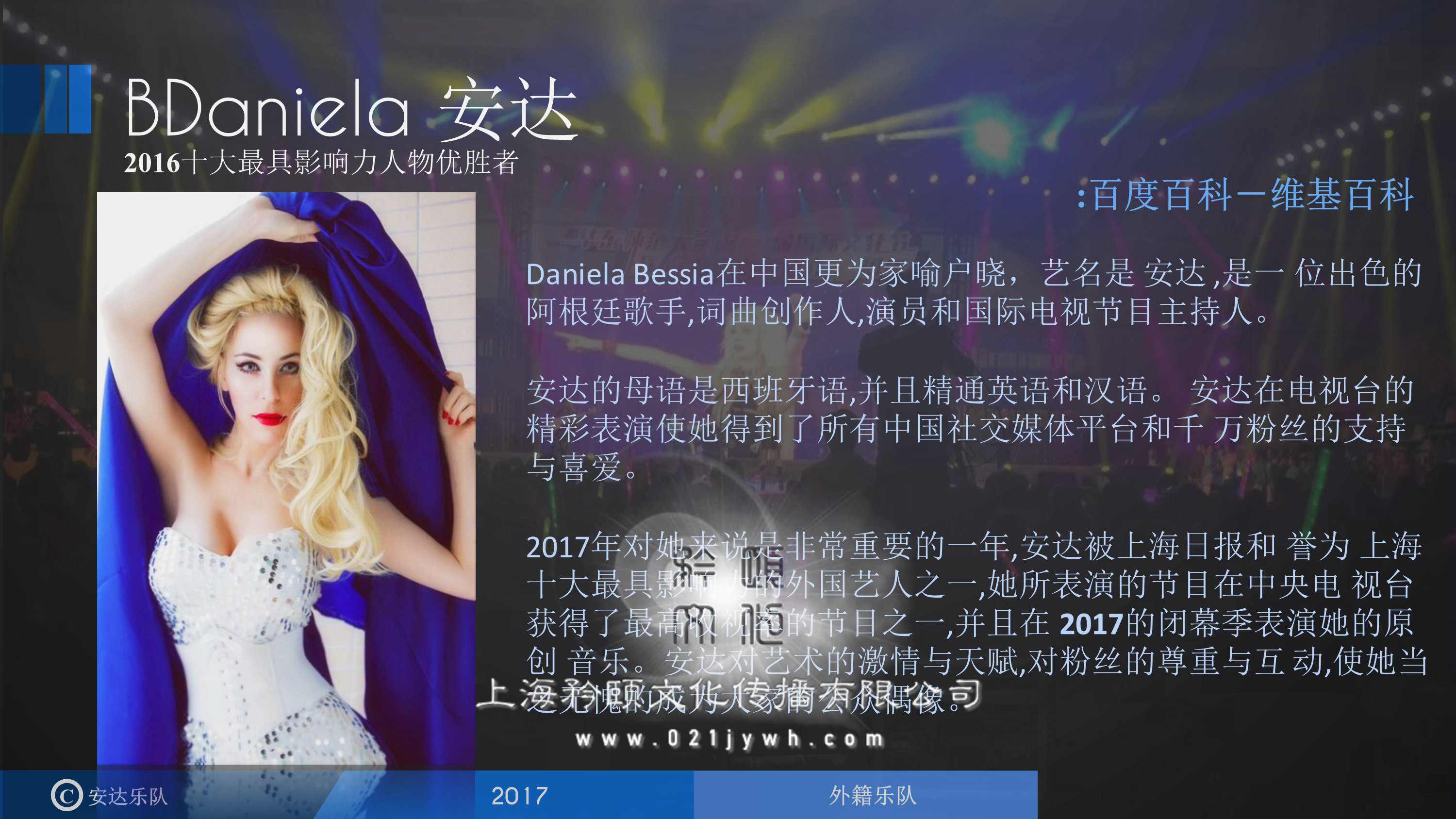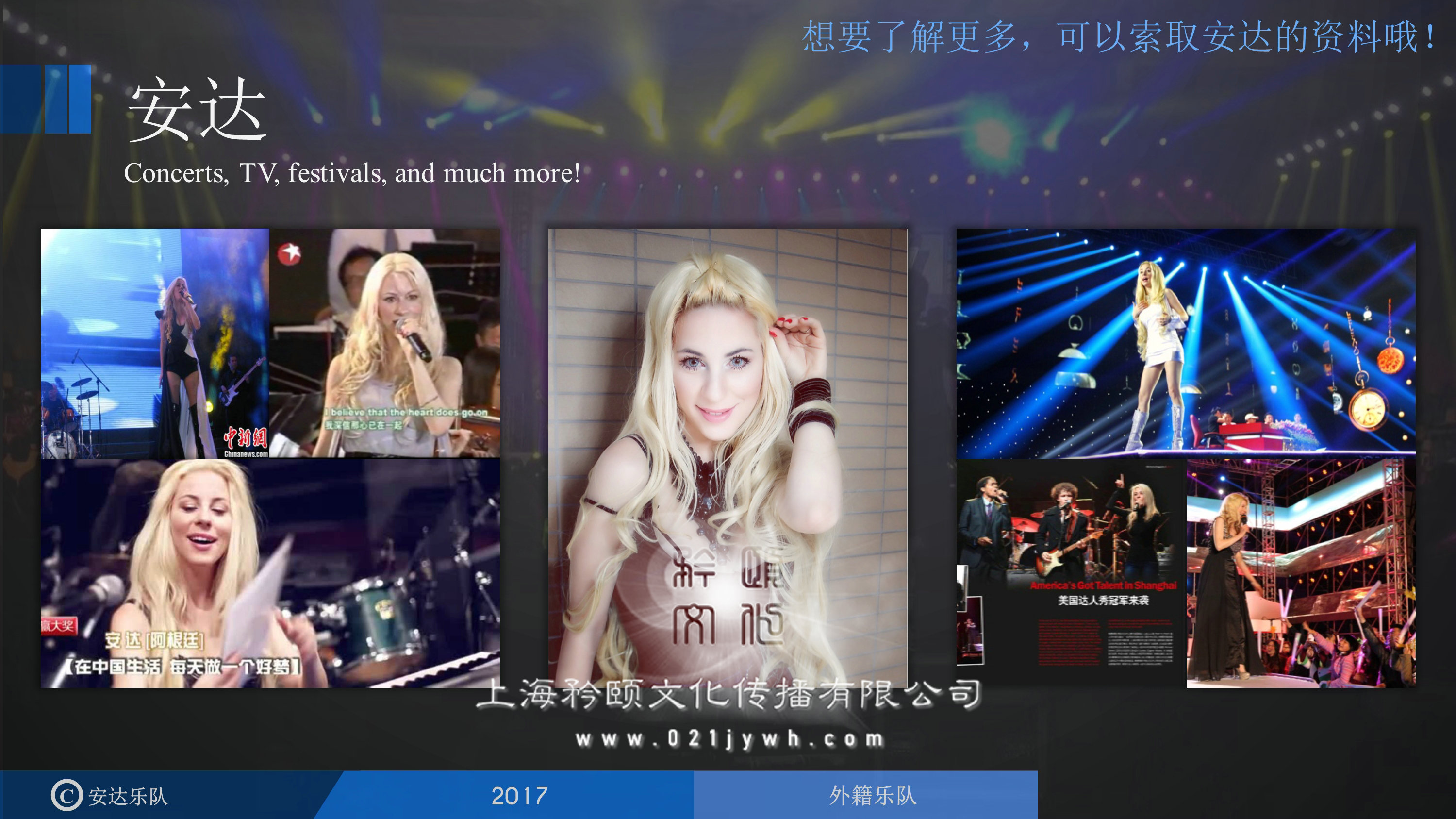 安達(dá)是一位來(lái)自阿根廷的歌手、作曲人、演員及藝人。她的官方優(yōu)酷頻道已經(jīng)有數(shù)十萬(wàn)次的以上的點(diǎn)擊。安達(dá)的母語(yǔ)是西班牙語(yǔ),并精通英語(yǔ)和漢語(yǔ)。
