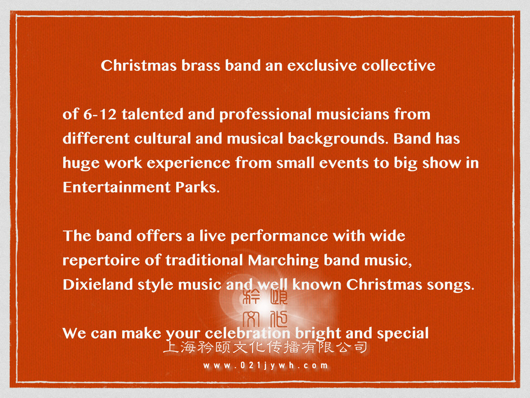 人氣推薦:圣誕節(jié)外籍表演樂隊(duì)CHRISTMAS BRASS BAND