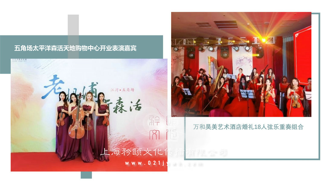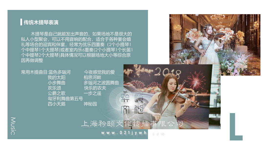 傳統木提琴表演,木提琴是自己就能發出聲音的,如果場地不是很大的私人小型聚會,可以不用音響的配合,適合于各種宴會婚禮等場合的迎賓和伴宴,經常為弦樂四重奏(2個小提琴1個中提琴1個大提琴)或者室內樂6重奏(2個小提琴1個長笛1個中提琴2個大提琴)具體情況可以根據場地大小等綜合原因再做調整
