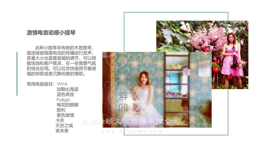 此種小提琴非傳統的木質提琴,是連接音箱靠電流的傳播進行發聲,音量大小也是靠音箱的調節,可以根據場地和客戶需求,在一些需要氣氛的場合應用。可以拉歡快激昂節奏感強的快歌或者沉靜優雅的慢歌。